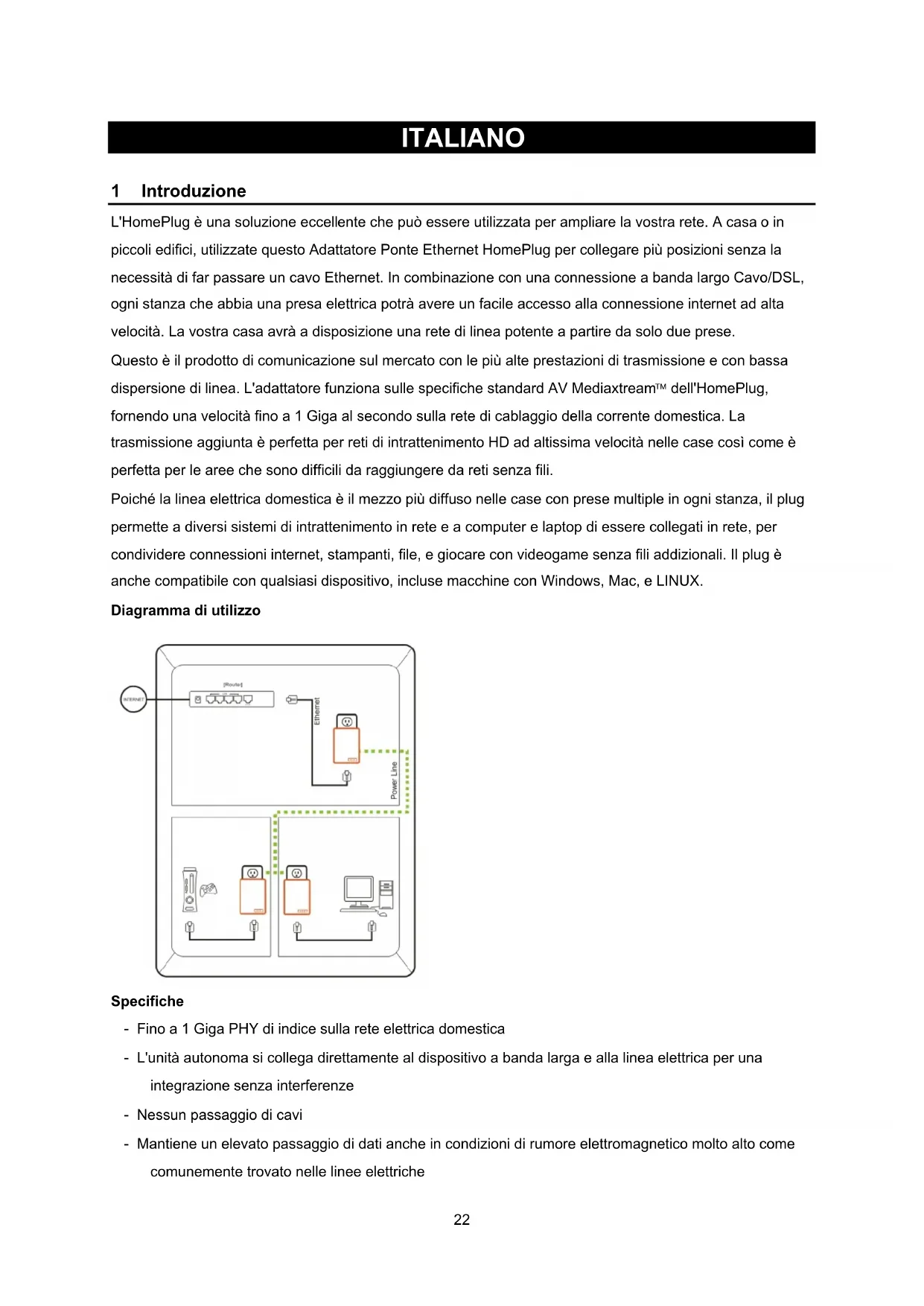 21ITALIANO HomePlug 1 Introduzione L'HomePlug è una soluzione eccellente che può essere utilizzata per ampliare la vostra rete. A casa o in piccoli edifici, utilizzate questo Adattatore Ponte Ethernet HomePlug per collegare più posizioni senza la necessità di far passare un cavo Ethernet. In combinazione con una connessione a banda largo Cavo/DSL, ogni stanza che abbia una presa elettrica potrà avere un facile accesso alla connessione internet ad alta velocità. La vostra casa avrà a disposizione una rete di linea potente a partire da solo due prese. Questo è il prodotto di comunicazione sul mercato con le più alte prestazioni di trasmissione e con bassa dispersione di linea. L'adattatore funziona sulle specifiche standard AV Mediaxtream
