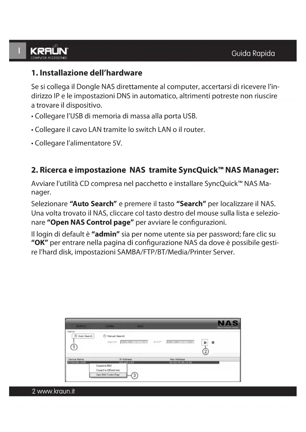 Avviare l’utilità CD compresa nel pacchetto e installare SyncQuick™ NAS Ma- nager. Selezionare “Auto Search” e premere il tasto “Search” per localizzare il NAS. Una volta trovato il NAS, cliccare col tasto destro del mouse sulla lista e selezio- nare “Open NAS Control page” per avviare le congurazioni. Il login di default è “admin” sia per nome utente sia per password; fare clic su “OK” per entrare nella pagina di congurazione NAS da dove è possibile gesti- re l’hard disk, impostazioni SAMBA/FTP/BT/Media/Printer Server.Guida Rapida 3www.kraun.it