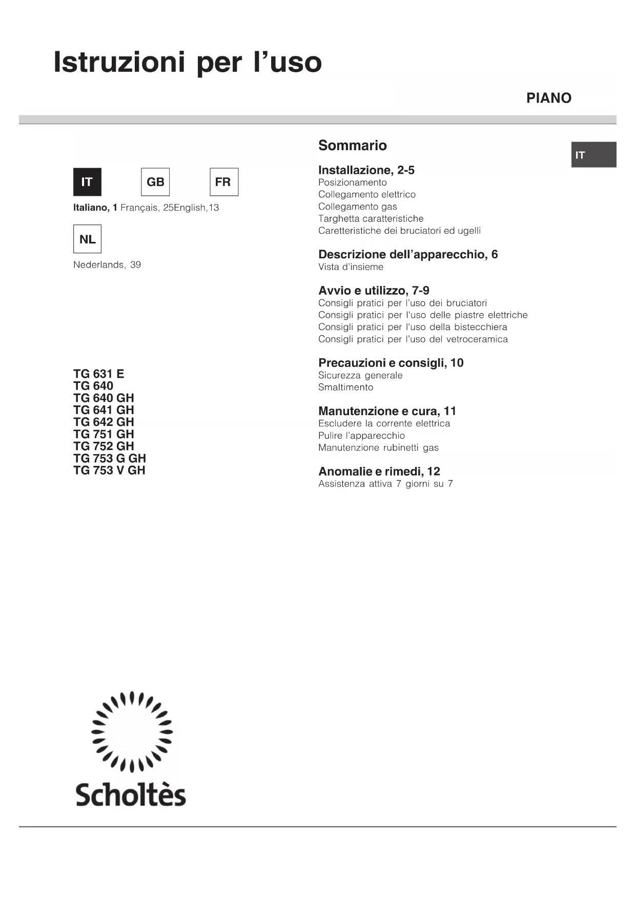 PIANO TG 631 E TG 640 TG 640 GH TG 641 GH TG 642 GH TG 751 GH TG 752 GH TG 753 G GH TG 753 V GH Sommario Installazione, 2-5 Posizionamento Collegamento elettrico Collegamento gas Targhetta caratteristiche Caretteristiche dei bruciatori ed ugelli Descrizione dell’apparecchio, 6 Vista d’insieme Avvio e utilizzo, 7-9 Consigli pratici per l’uso dei bruciatori Consigli pratici per l'uso delle piastre elettriche Consigli pratici per l'uso della bistecchiera Consigli pratici per l’uso del vetroceramica Precauzioni e consigli, 10 Sicurezza generale Smaltimento Manutenzione e cura, 11 Escludere la corrente elettrica Pulire l’apparecchio Manutenzione rubinetti gas Anomalie e rimedi, 12 Assistenza attiva 7 giorni su 7 Istruzioni per l’uso Italiano, 1 Français, 25English,13