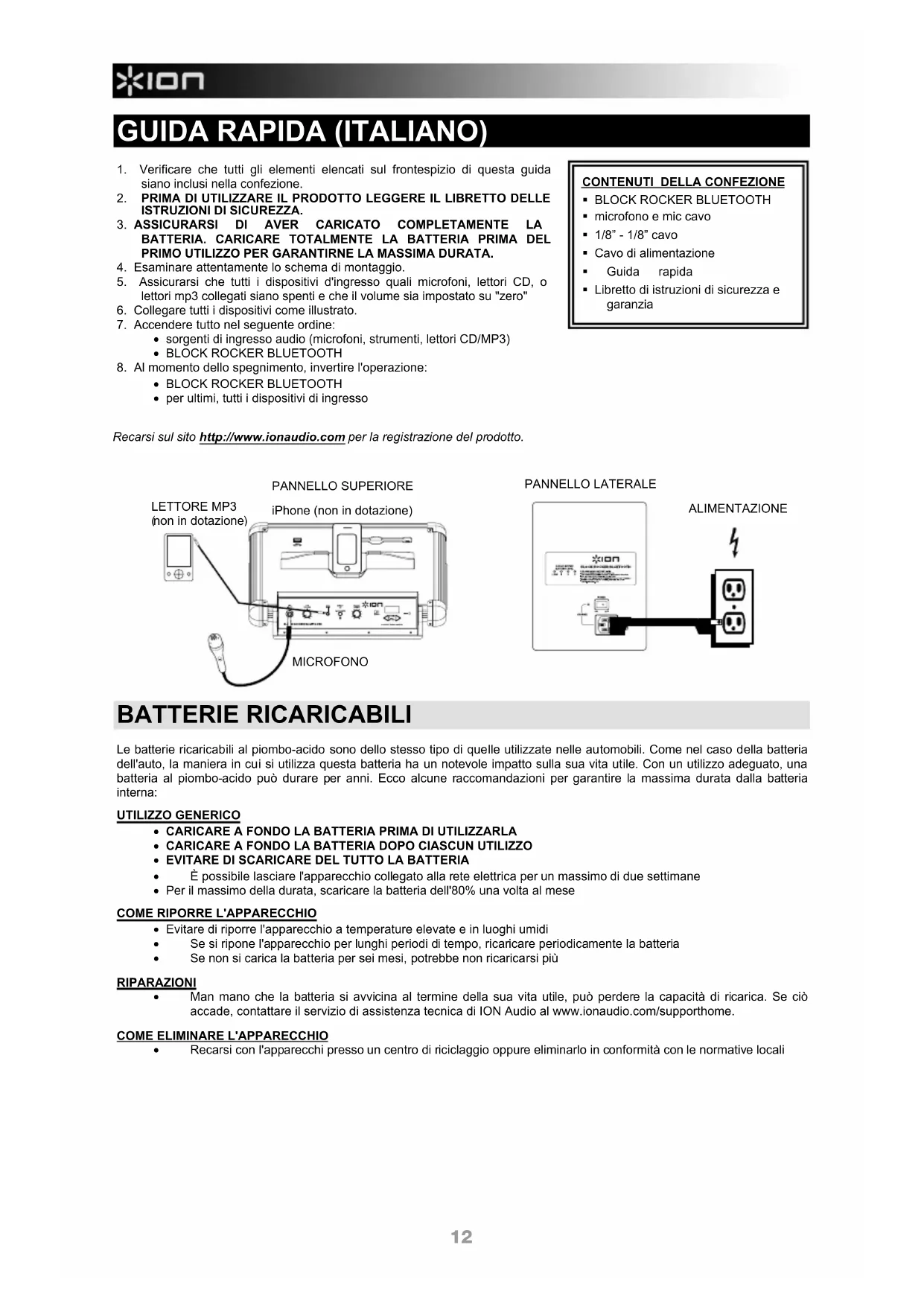 - Man mano che la batteria si avvicina al termine della sua vita utile, può perdere la capacità di ricarica. Se ciò accade, contattare il servizio di assistenza tecnica di ION Audio al www.ionaudio.com/supporthome.