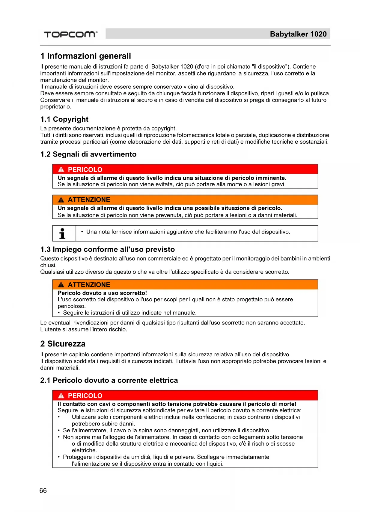1 Informazioni generali Il presente manuale di istruzioni fa parte di Babytalker 1020 (d'ora in poi chiamato "il dispositivo"). Contiene importanti informazioni sull'impostazione del monitor, aspetti che riguardano la sicurezza, l'uso corretto e la manutenzione del monitor. Il manuale di istruzioni deve essere sempre conservato vicino al dispositivo. Deve essere sempre consultato e seguito da chiunque faccia funzionare il dispositivo, ripari i guasti e/o lo pulisca. Conservare il manuale di istruzioni al sicuro e in caso di vendita del dispositivo si prega di consegnarlo al futuro proprietario.