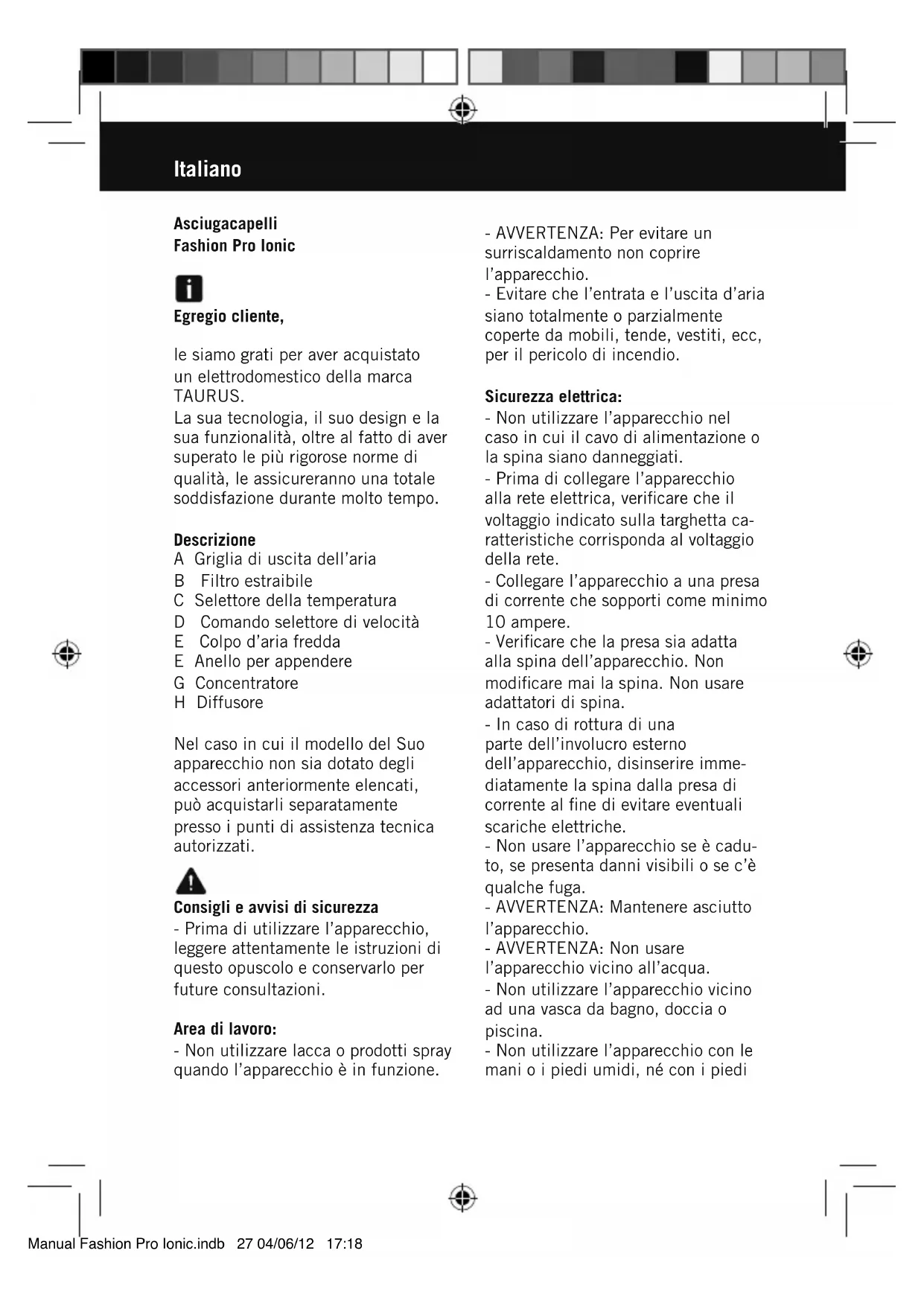 Scarica le istruzioni per il tuo Asciugacapelli in formato PDF gratuitamente! Trova il tuo manuale Fashion PRO Ionic - TAURUS e riprendi in mano il tuo dispositivo elettronico. In questa pagina sono pubblicati tutti i documenti necessari per l'utilizzo del tuo dispositivo. Fashion PRO Ionic del marchio TAURUS.
