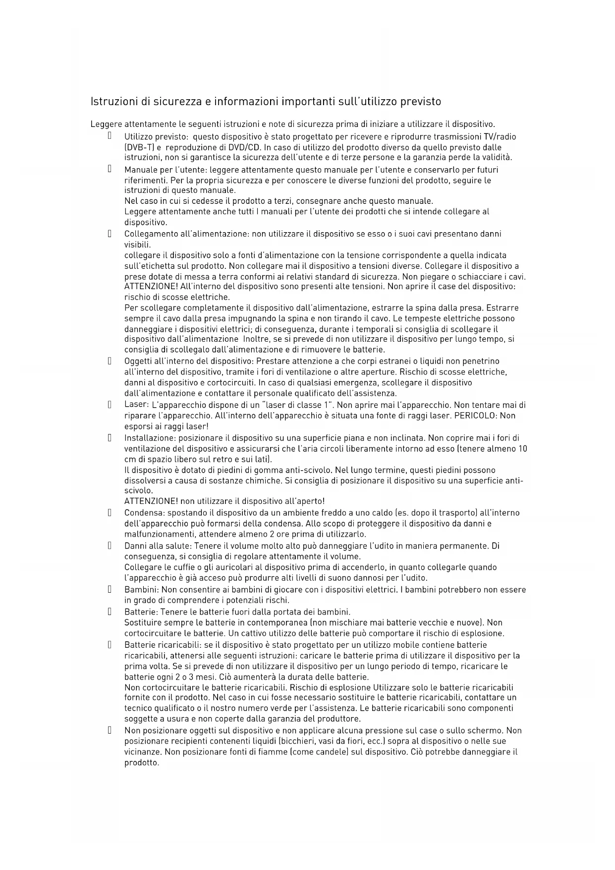 Utilizzo previsto: questo dispositivo è stato progettato per ricevere e riprodurre trasmissioni TV/radio (DVB-T) e reproduzione di DVD/CD. In caso di utilizzo del prodotto diverso da quello previsto dalle istruzioni, non si garantisce la sicurezza dell’utente e di terze persone e la garanzia perde la validità.