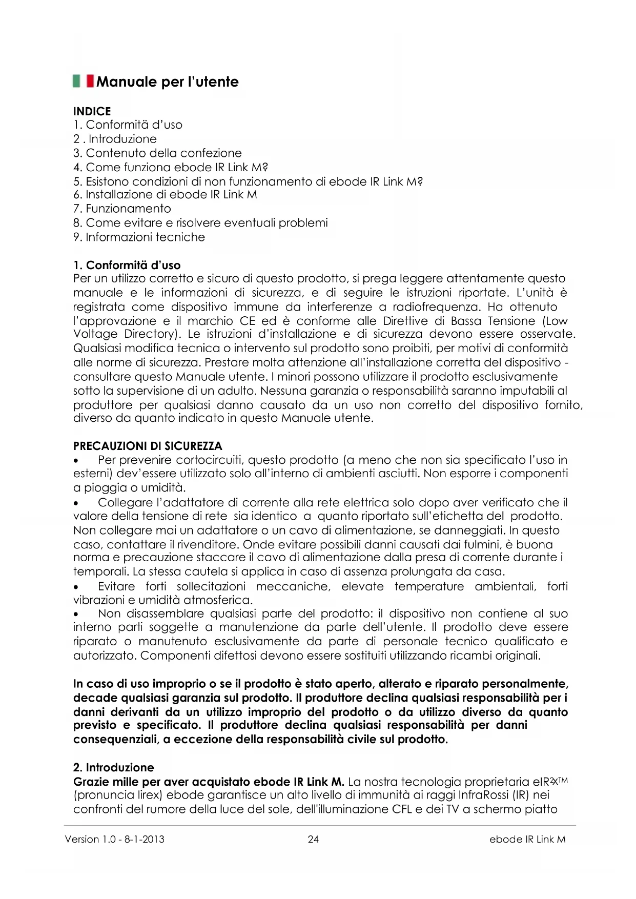 Per un utilizzo corretto e sicuro di questo prodotto, si prega leggere attentamente questo manuale e le informazioni di sicurezza, e di seguire le istruzioni riportate. L’unità è registrata come dispositivo immune da interferenze a radiofrequenza. Ha ottenuto l’approvazione e il marchio CE ed è conforme alle Direttive di Bassa Tensione (Low Voltage Directory). Le istruzioni d’installazione e di sicurezza devono essere osservate. Qualsiasi modifica tecnica o intervento sul prodotto sono proibiti, per motivi di conformità alle norme di sicurezza. Prestare molta attenzione all’installazione corretta del dispositivo - consultare questo Manuale utente. I minori possono utilizzare il prodotto esclusivamente sotto la supervisione di un adulto. Nessuna garanzia o responsabilità saranno imputabili al produttore per qualsiasi danno causato da un uso non corretto del dispositivo fornito, diverso da quanto indicato in questo Manuale utente.