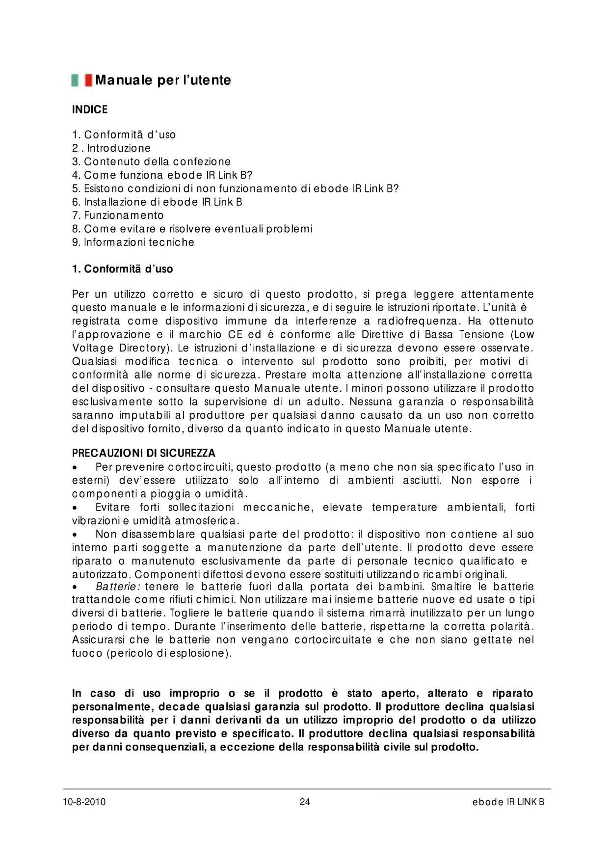 In caso di uso improprio o se il prodotto è stato aperto, alterato e riparato personalmente, decade qualsiasi garanzia sul prodotto. Il produttore declina qualsiasi responsabilità per i danni derivanti da un utilizzo improprio del prodotto o da utilizzo diverso da quanto previsto e specificato. Il produttore declina qualsiasi responsabilità per danni consequenziali, a eccezione della responsabilità civile sul prodotto.10-8-2010 25 ebode IR LINK B