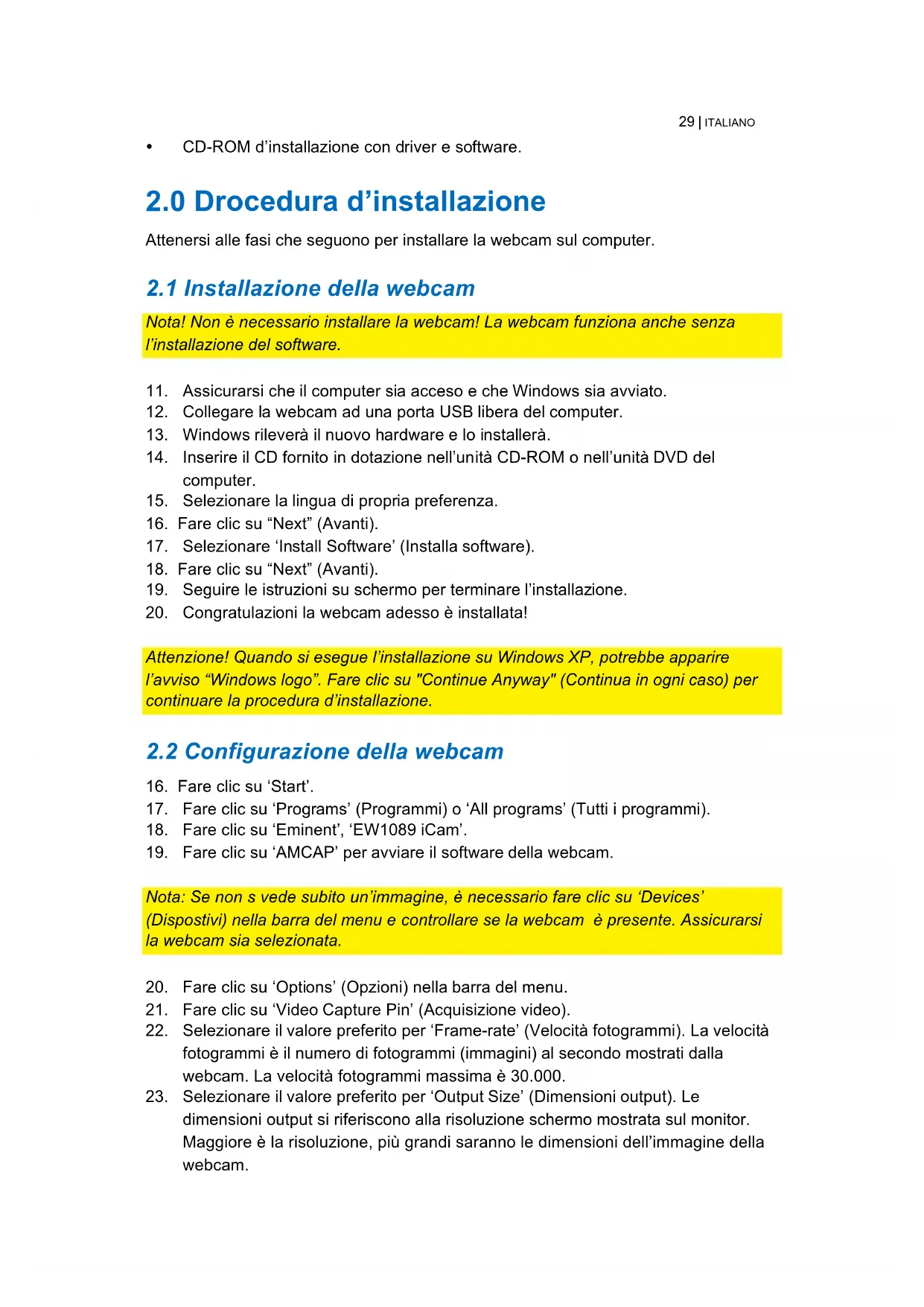 Note! Non è necessario installare la webcam! La webcam funzionaanche segna l'installazione del software.