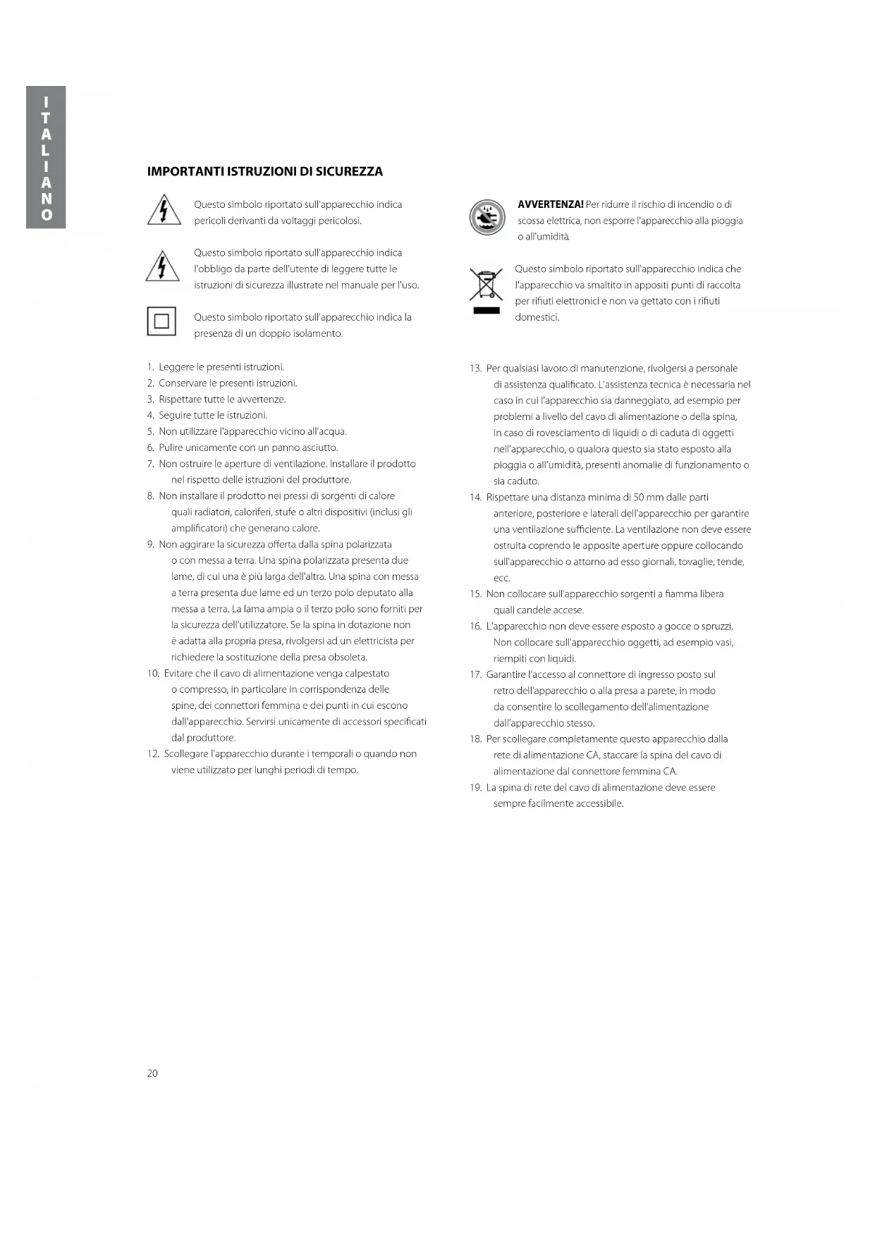 16. L'apparecchio non deve essere esposto a gocce o spruzzi.