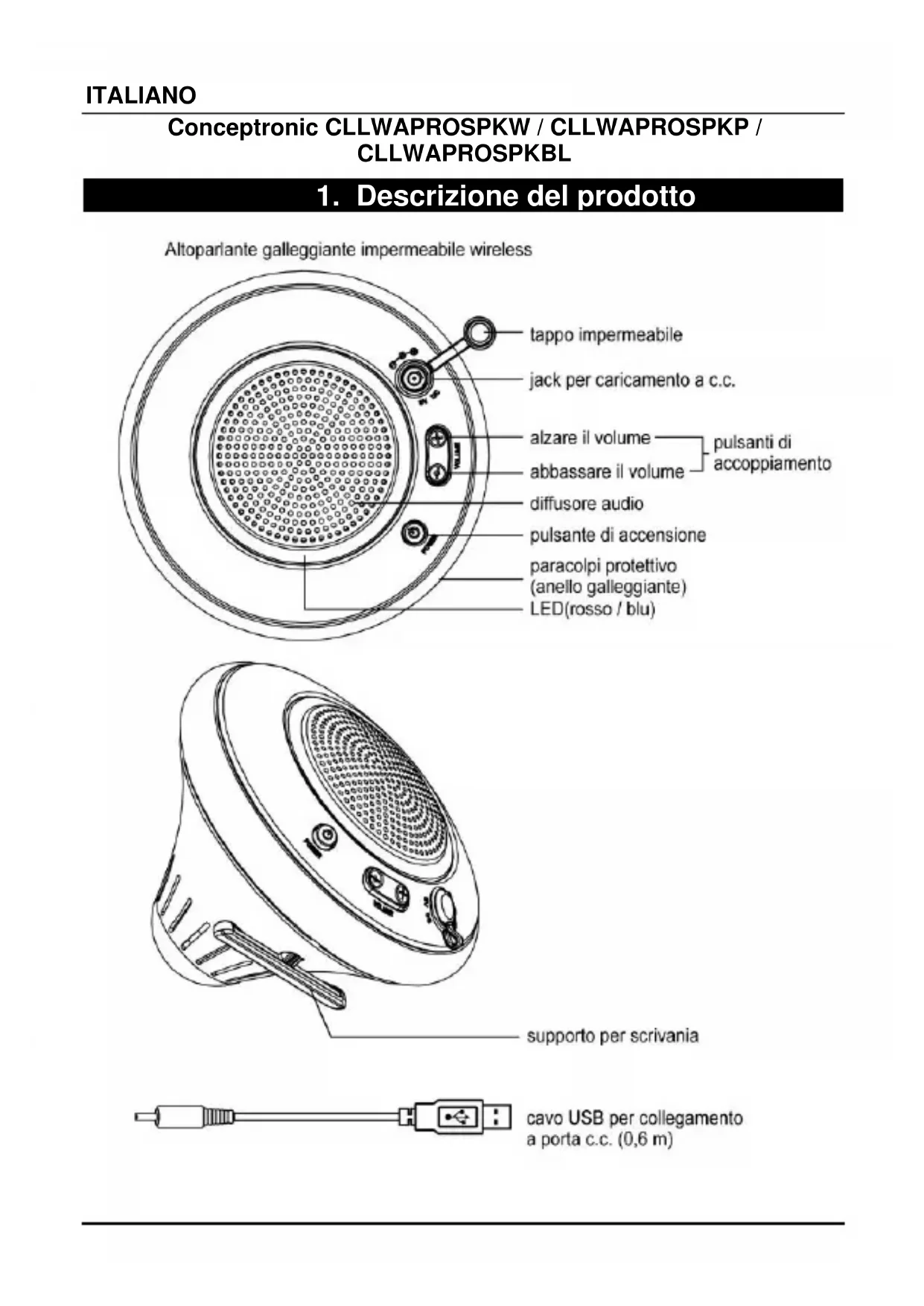 Caricamento veloce: Per caricarlo, collegare l’apparecchio a un cavo di caricamento USB. Quando la spia a LED assume colore ROSSO, l’apparecchio si sta caricando. La spia a LED si spegne quando il dispositivo si è caricato completamente. Avvertenza: non caricare il prodotto quando è bagnato; accertarsi che il prodotto sia asciutto prima di metterlo sotto carica per evitare il rischio di folgorazione. Nota: accertarsi che l’altoparlante galleggiante impermeabile wireless sia completamente carico prima di usarlo. Una carica completa richiede circa 4 ore e consente una successiva riproduzione di musica ininterrotta per 8 ore. Stati della spia: ROSSO: modalità di caricamento BLU: (lampeggiamento veloce) modalità di accoppiamento BLU: modalità di riproduzione Utilizzo: Accendere lo smartphone, il tablet o il PC e andare alla finestra di impostazione Bluetooth. Accendere il dispositivo Bluetooth. Il dispositivo Bluetooth apparirà sullo smartphone, sul tablet o sul PC. Selezionare “CLLWAPROSPKW”, “CLLWAPROSPKP”, o ”CLLWAPROSPKBL”. Nota: : Premere una sola volta per ACCENDERE. Premere nuovamente per SPEGNERE. : Premere entrambi i pulsanti per 2 secondi per eseguire l’accoppiamento Nota: ogni volta che il dispositivo viene acceso si collegherà automaticamente all’ultimo dispositivo a cui era stato connesso. Se dopo 10 minuti non è possibile effettuare la connessione con alcun dispositivo l’altoparlante si spegnerà automaticamente per risparmiare energia. Ricordare diITALIANO spegnere il dispositivo quando non viene utilizzato in modo da risparmiare energia. Risposta alle chiamate in arrivo: Se si riceve una chiamata mentre si sta ascoltando musica con l’altoparlante, la riproduzione della musica entrerà in pausa. Dopo che si è risposto alla chiamata in arrivo, la riproduzione della musica riprenderà.ITALIANO