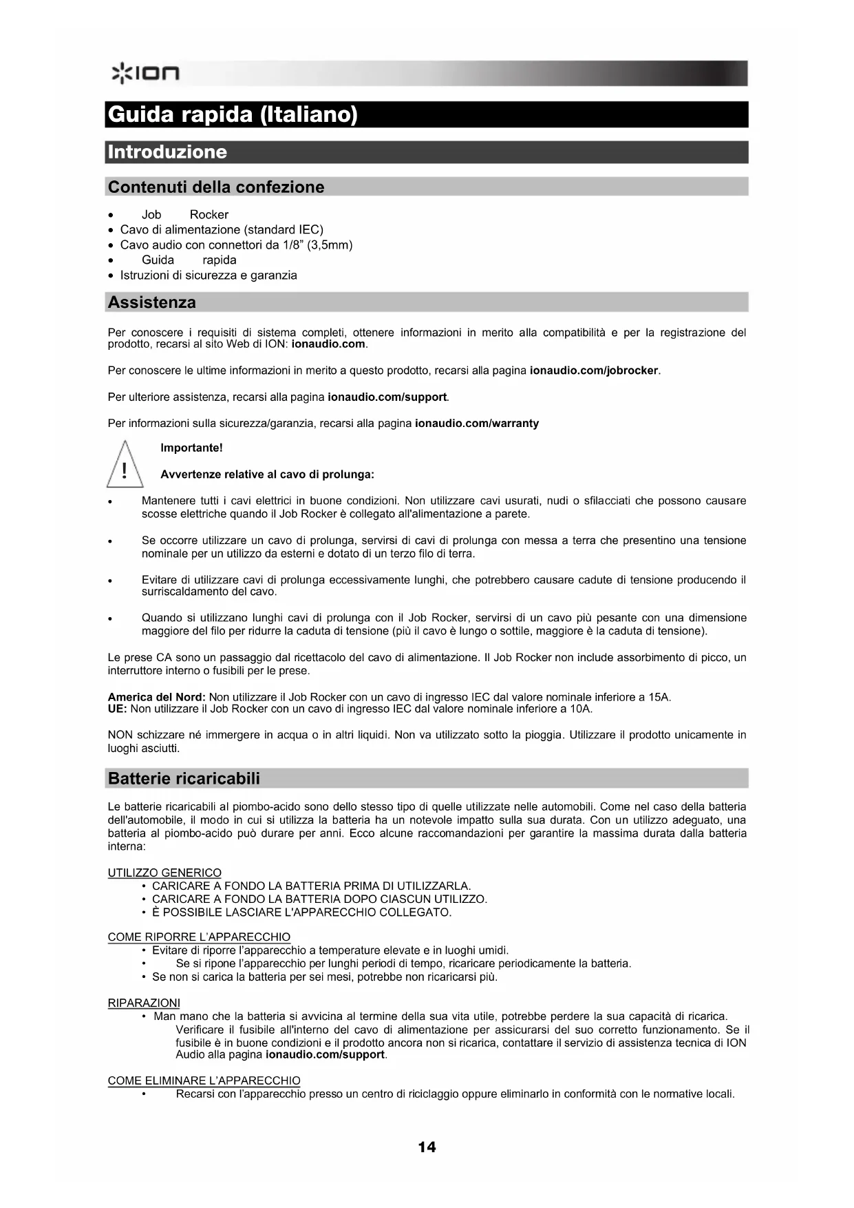 - Job Rocker • Cavo di alimentazione (standard IEC) • Cavo audio con connettori da 1/8” (3,5mm) • Guida rapida • Istruzioni di sicurezza e garanzia Assistenza Per conoscere i requisiti di sistema completi, ottenere informazioni in merito alla compatibilità e per la registrazione del prodotto, recarsi al sito Web di ION: ionaudio.com. Per conoscere le ultime informazioni in merito a questo prodotto, recarsi alla pagina ionaudio.com/jobrocker. Per ulteriore assistenza, recarsi alla pagina ionaudio.com/support. Per informazioni sulla sicurezza/garanzia, recarsi alla pagina ionaudio.com/warranty Importante! Avvertenze relative al cavo di prolunga: