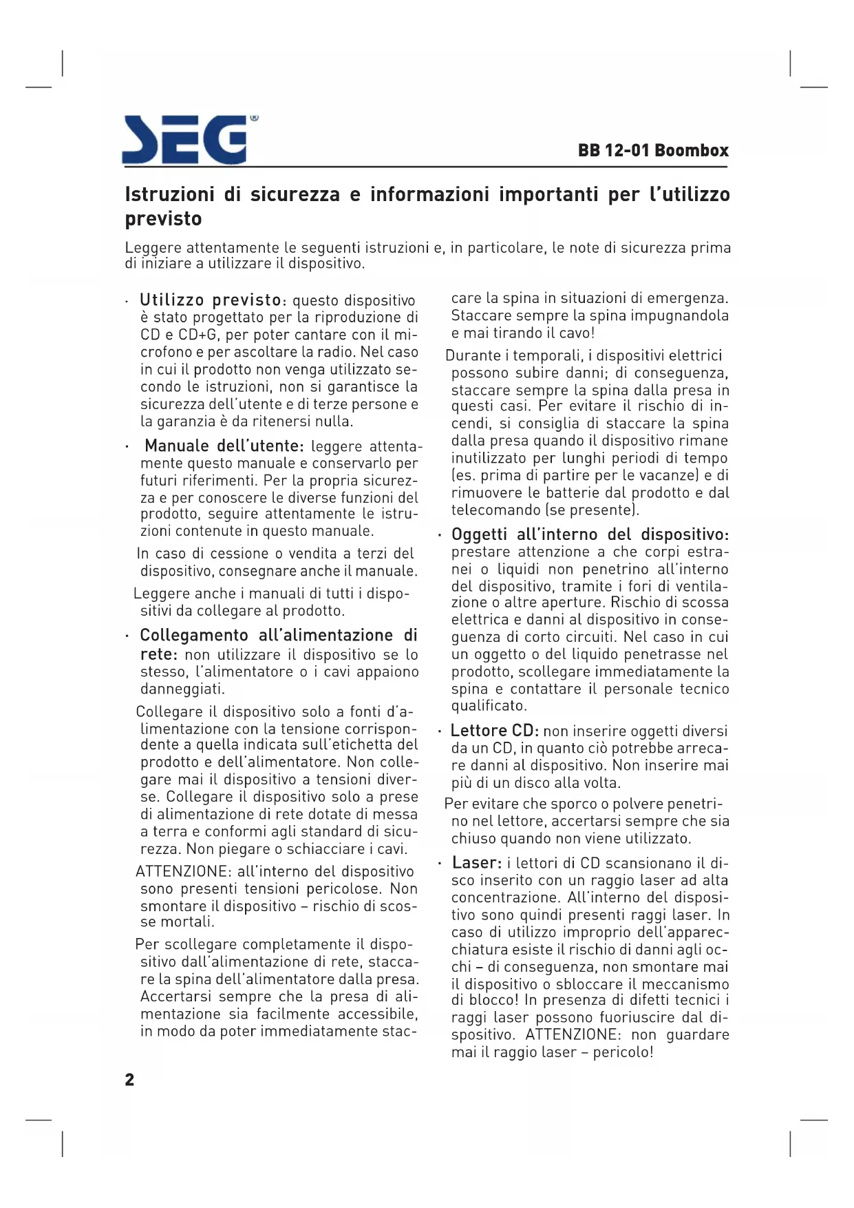 Istruzioni di sicurezza e informazioni importanti per l’utilizzo previsto 2