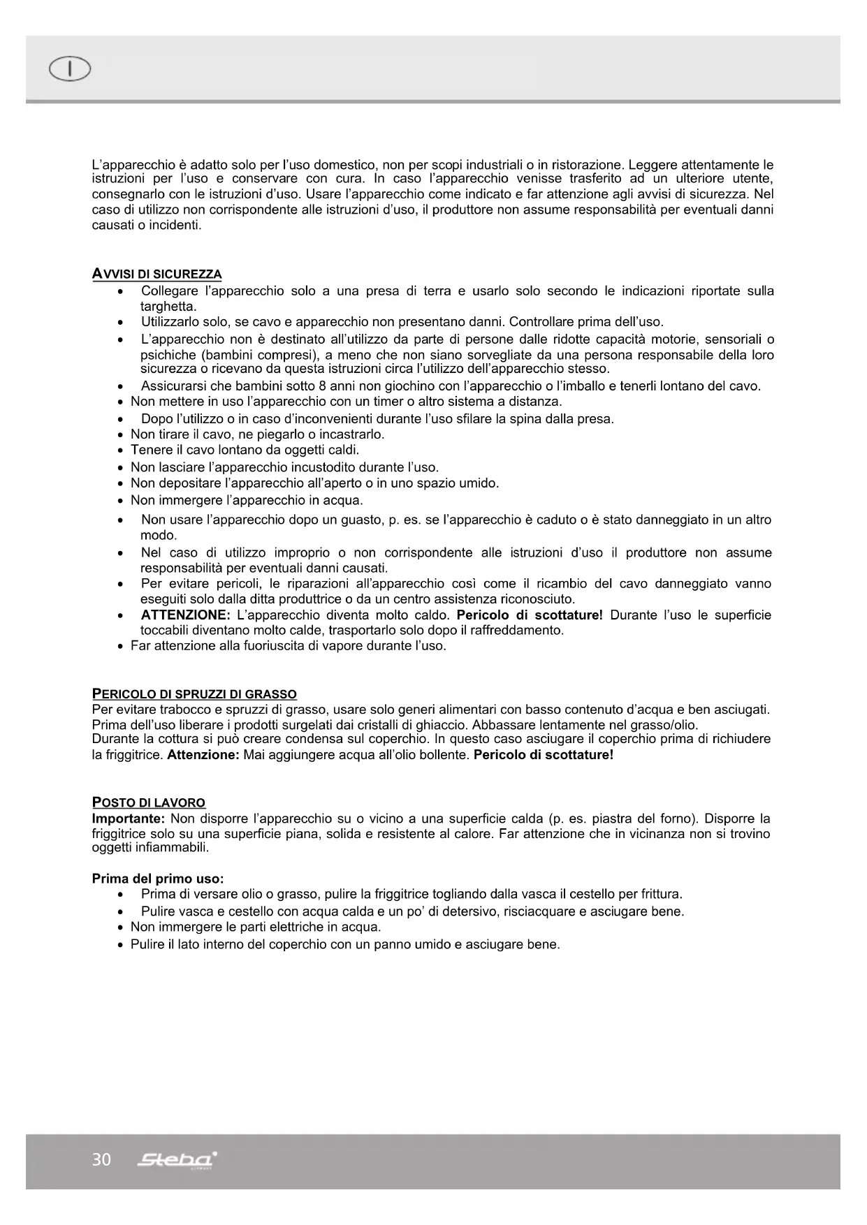 L’apparecchio è adatto solo per l’uso domestico, non per scopi industriali o in ristorazione. Leggere attentamente le istruzioni per l’uso e conservare con cura. In caso l’apparecchio venisse trasferito ad un ulteriore utente, consegnarlo con le istruzioni d’uso. Usare l’apparecchio come indicato e far attenzione agli avvisi di sicurezza. Nel caso di utilizzo non corrispondente alle istruzioni d’uso, il produttore non assume responsabilità per eventuali danni causati o incidenti.