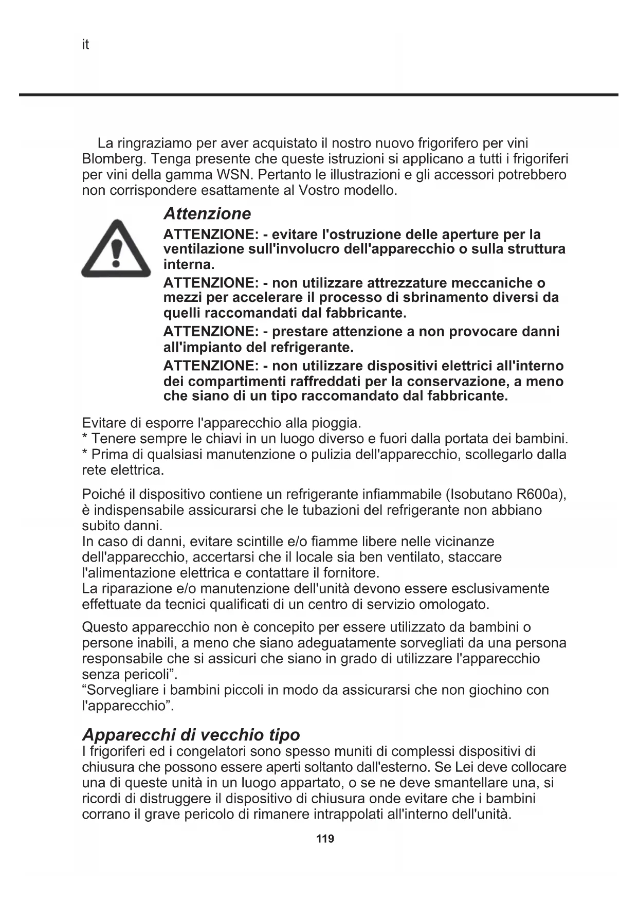 Garanzia, parti di ricambio e assistenza131 Si ricordi inoltre di rispettare scrupolosamente le normative ambientali. Quando deve smantellare l'apparecchio, contatti l'ufficio tecnico del Suo Comune per informarsi del modo in cui la raccolta ed il riciclaggio di queste unità avvengono nella Sua zona. Questo apparecchio è contrassegnato in conformità alla direttiva europea 2002/96/ EC WEEE (in italiano RAEE: Rifiuti apparecchiature elettriche ed elettroniche). Assicurandovi che questo prodotto venga eliminato correttamente, collaborerete alla prevenzione di potenziali conseguenze negative per l'ambiente e la salute umana che potrebbero essere causate da uno smaltimento inappropriato di questo prodotto. Il simbolo riportato sul prodotto o sui documenti di accompagnamento dello stesso indica che questo apparecchio non può essere trattato allo stesso modo dei rifiuti domestici. Al contrario, esso dovrà essere consegnato ad un adeguato punto di raccolta per il riciclaggio delle apparecchiature elettriche. Lo smaltimento deve essere effettuato in conformità alle norme ambientali locali per lo smaltimento dei rifiuti. Per informazioni più dettagliate sul trattamento, il recupero e il riciclaggio di questo prodotto, Vi invitiamo a contattare il Vostro comune, il Vostro servizio per la raccolta dei rifiuti domestici o il negozio presso il quale il prodotto è stato acquistato. Smaltimento132 Спасибо за то, что Вы купили новый винный холодильник от Blomberg. Просим отметить, что эта инструкция по эксплуатации подходит ко всем винным холодильникам серии WSN. Поэтому не все иллюстрации и оснащение могут точно соответствовать вашей модели.
