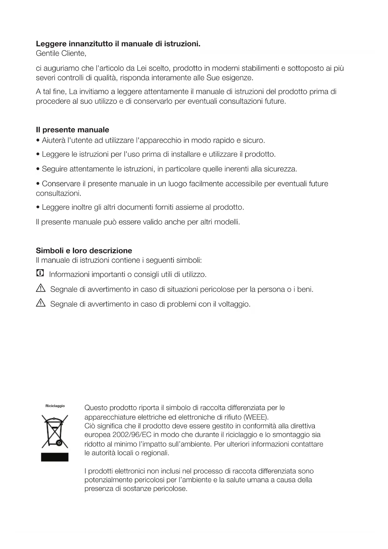 - Leggere inoltre gli altri documenti forniti assieme al prodotto. Il presente manuale può essere valido anche per altri modelli. Simboli e loro descrizione Il manuale di istruzioni contiene i seguenti simboli: C Informazioni importanti o consigli utili di utilizzo. A Segnale di avvertimento in caso di situazioni pericolose per la persona o i beni. B Segnale di avvertimento in caso di problemi con il voltaggio. Questo prodotto riporta il simbolo di raccolta differenziata per le apparecchiature elettriche ed elettroniche di rifiuto (WEEE). Ciò significa che il prodotto deve essere gestito in conformità alla direttiva europea 2002/96/EC in modo che durante il riciclaggio e lo smontaggio sia ridotto al minimo l’impatto sull’ambiente. Per ulteriori informazioni contattare le autorità locali o regionali. I prodotti elettronici non inclusi nel processo di raccota differenziata sono potenzialmente pericolosi per l’ambiente e la salute umana a causa della presenza di sostanze pericolose. RiciclaggioIT