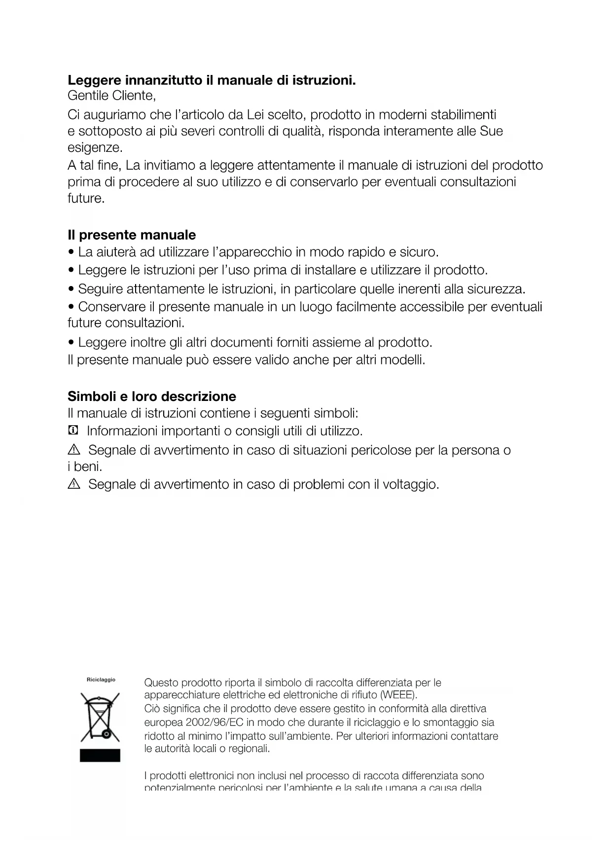 - Leggere inoltre gli altri documenti forniti assieme al prodotto. Il presente manuale può essere valido anche per altri modelli. Simboli e loro descrizione Il manuale di istruzioni contiene i seguenti simboli: C Informazioni importanti o consigli utili di utilizzo. A Segnale di avvertimento in caso di situazioni pericolose per la persona o i beni. B Segnale di avvertimento in caso di problemi con il voltaggio. Questo prodotto riporta il simbolo di raccolta differenziata per le apparecchiature elettriche ed elettroniche di rifiuto (WEEE). Ciò significa che il prodotto deve essere gestito in conformità alla direttiva europea 2002/96/EC in modo che durante il riciclaggio e lo smontaggio sia ridotto al minimo l’impatto sull’ambiente. Per ulteriori informazioni contattare le autorità locali o regionali. I prodotti elettronici non inclusi nel processo di raccota differenziata sono potenzialmente pericolosi per l’ambiente e la salute umana a causa della presenza di sostanze pericolose. RiciclaggioIT