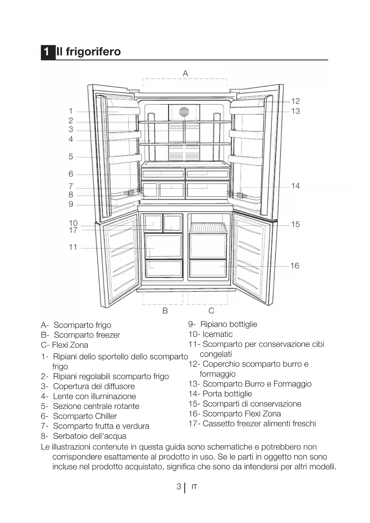 17 Tasto funzione Ice off 18 Indicatore funzione Ice off Le illustrazioni contenute in questa guida sono schematiche e potrebbero non corrispondere esattamente al prodotto in uso. Se le parti in oggetto non sono incluse nel prodotto acquistato, significa che sono da intendersi per altri modelli.IT