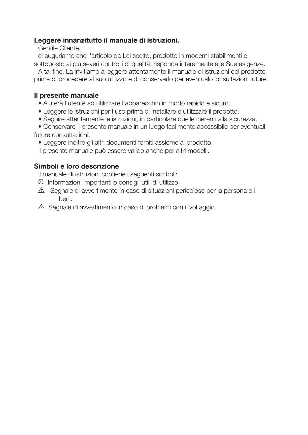 - Mat kan berøre taket i skuffen. Ordne maten i skuffen på nytt.Leggere innanzitutto il manuale di istruzioni. Gentile Cliente, ci auguriamo che l'articolo da Lei scelto, prodotto in moderni stabilimenti e sottoposto ai più severi controlli di qualità, risponda interamente alle Sue esigenze. A tal fine, La invitiamo a leggere attentamente il manuale di istruzioni del prodotto prima di procedere al suo utilizzo e di conservarlo per eventuali consultazioni future. Il presente manuale