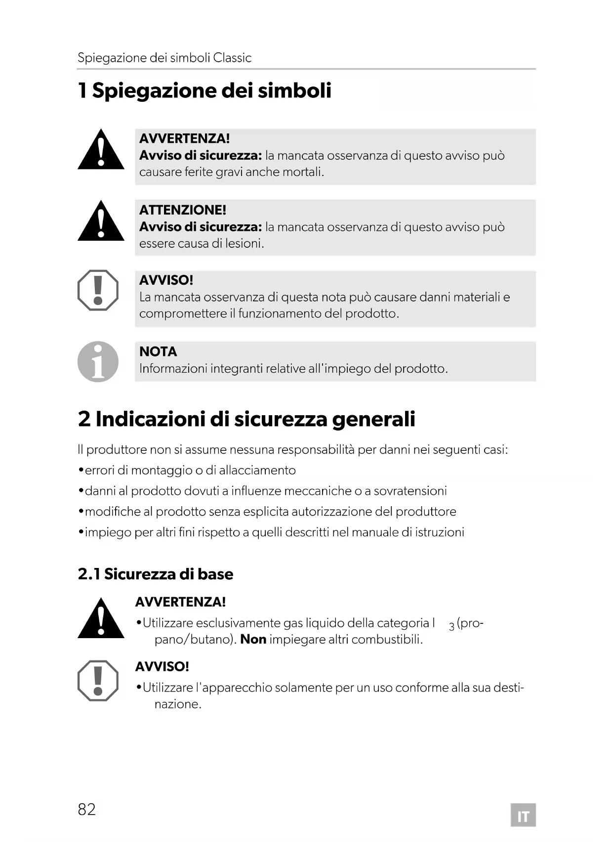 - Utilizzato esclusivamente gas liquido della categoria 1 (propano/butano). Non impiegare altri combustibili.