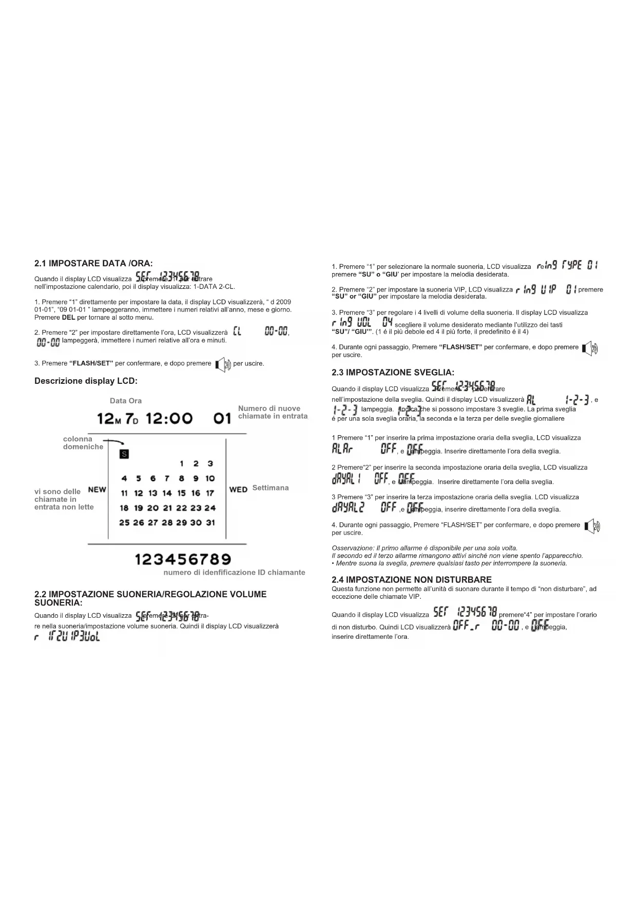 SUONERIA: Quando il display LCD visualizza , premere “2” per entra- re nella suoneria/impostazione volume suoneria. Quindi il display LCD visualizzerà Data Ora Settimana Numero di nuove chiamate in entrata numero di idencazione ID chiamante colonna domeniche vi sono delle chiamate in entrata non lette