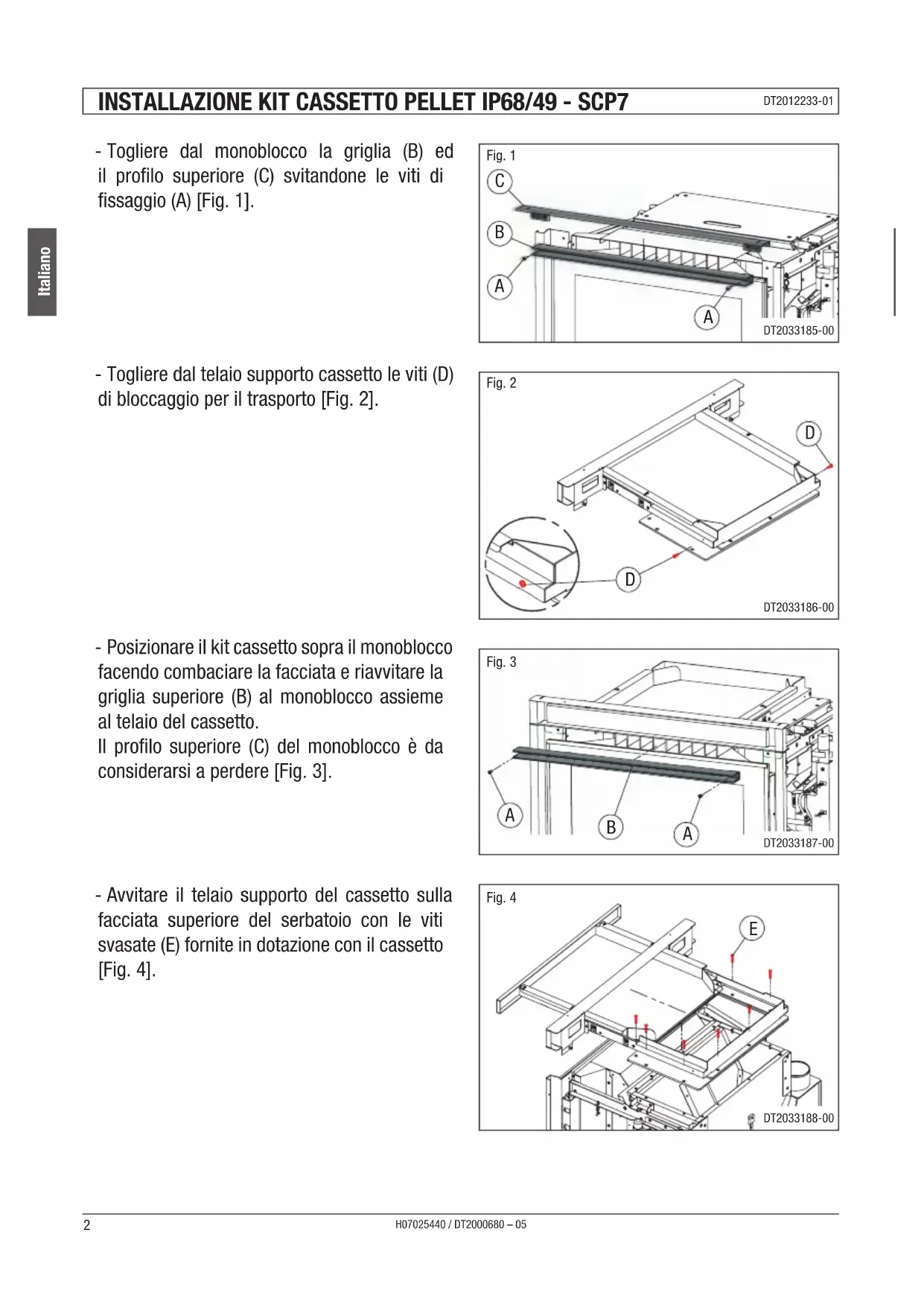 Avvitare il telaio supporto del cassetto sulla facciata superiore del serbatoio con le viti svasate (E) fornite in dotazione con il cassetto [Fig. 4].