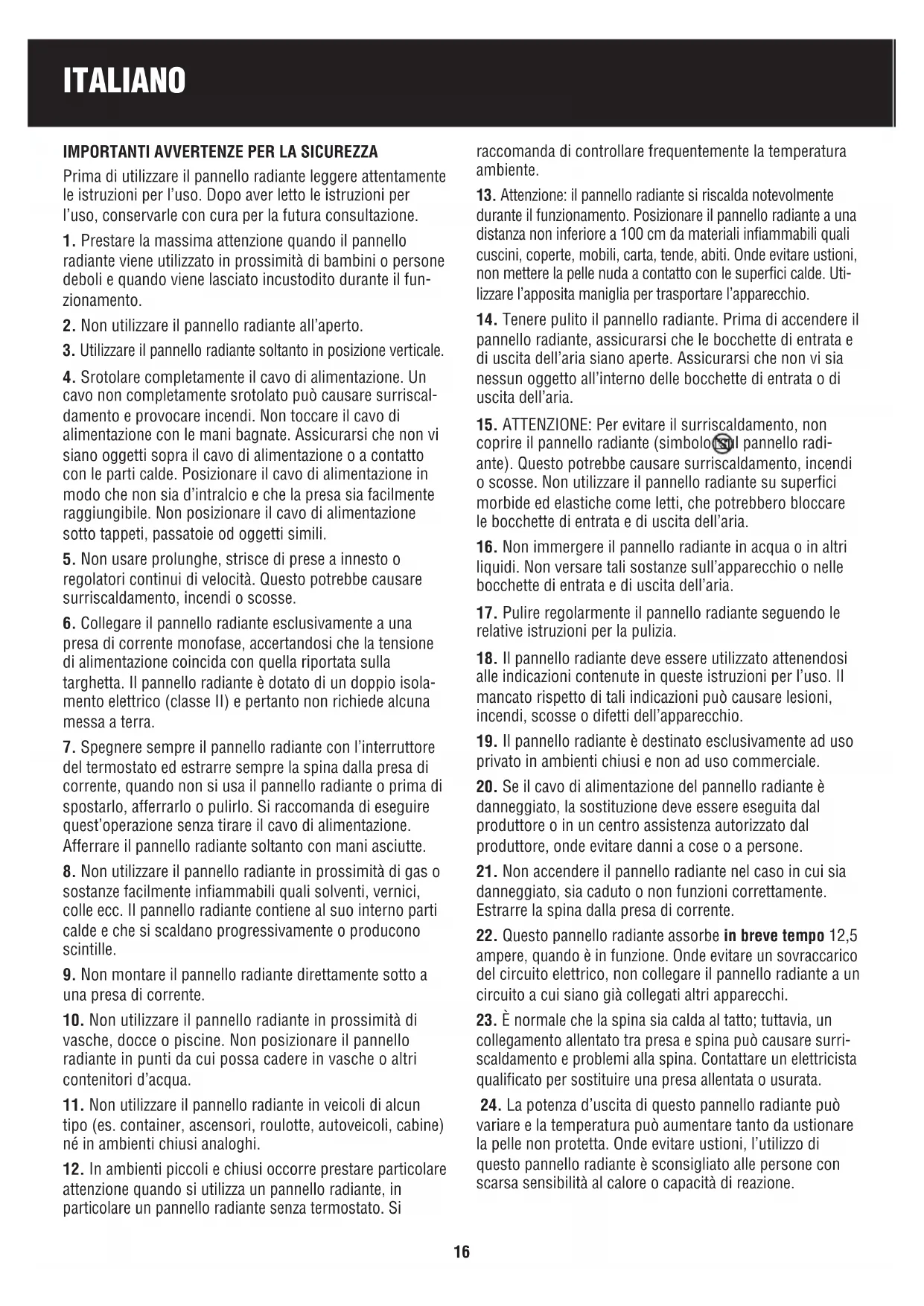 IMPORTANTI AVVERTENZE PER LA SICUREZZA Prima di utilizzare il pannello radiante leggere attentamente