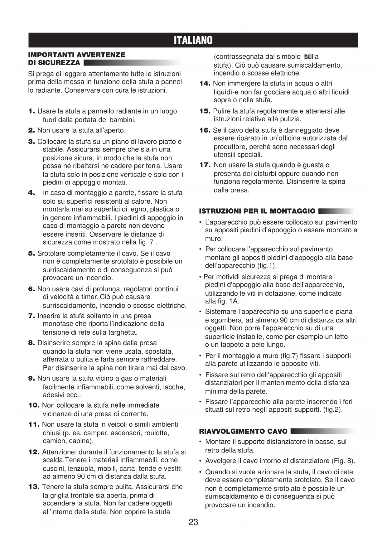 ITALIANO IMPORTANTI AVVERTENZE DI SICUREZZA Si prega di leggere attentamente tutte le istruzioni