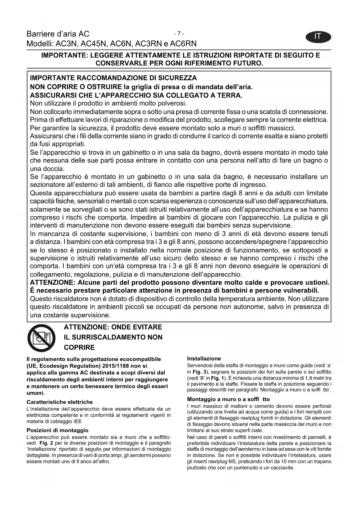 NON COPRIRE O OSTRUIRE la griglia di presa o di mandata dell’aria. ASSICURARSI CHE L’APPARECCHIO SIA COLLEGATO A TERRA. Non utilizzare il prodotto in ambienti molto polverosi. Non collocarlo immediatamente sopra o sotto una presa di corrente fi ssa o una scatola di connessione. Prima di eff ettuare lavori di riparazione o modifi ca del prodotto, scollegare sempre la corrente elettrica. Per garantire la sicurezza, il prodotto deve essere montato solo a muri o soffi tti massicci. Assicurarsi che i fi li della corrente siano in grado di condurre il carico di corrente esatta e siano protetti da fusi appropriati. Se l’apparecchio si trova in un gabinetto o in una sala da bagno, dovrà essere montato in modo tale che nessuna delle sue parti possa entrare in contatto con una persona nell’atto di fare un bagno o una doccia. Se l’apparecchio è montato in un gabinetto o in una sala da bagno, è necessario installare un sezionatore all’esterno di tali ambienti, di fi anco alle rispettive porte di ingresso. Questa apparecchiatura può essere usata da bambini a partire dagli 8 anni e da adulti con limitate capacità fi siche, sensoriali o mentali o con scarsa esperienza o conoscenza sull’uso dell’apparecchiatura, solamente se sorvegliati o se sono stati istruiti relativamente all’uso dell’apparecchiatura e se hanno compreso i rischi che comporta. Impedire ai bambini di giocare con l’apparecchio. La pulizia e gli interventi di manutenzione non devono essere eseguiti dai bambini senza supervisione. In mancanza di costante supervisione, i bambini con meno di 3 anni di età devono essere tenuti a distanza. I bambini con età compresa tra i 3 e gli 8 anni, possono accendere/spegnere l‘apparecchio se lo stesso è posizionato o installato nella normale posizione di funzionamento, se sottoposti a supervisione o istruiti relativamente all’uso sicuro dello stesso e se hanno compreso i rischi che comporta. I bambini con un‘età compresa tra i 3 e gli 8 anni non devono eseguire le operazioni di collegamento, regolazione, pulizia e di manutenzione dell’apparecchio. ATTENZIONE: Alcune parti del prodotto possono diventare molto calde e provocare ustioni. È necessario prestare particolare attenzione in presenza di bambini e persone vulnerabili. Questo riscaldatore non è dotato di dispositivo di controllo della temperatura ambiente. Non utilizzare questo riscaldatore in ambienti piccoli se occupati da persone non autonome, salvo in presenza di una costante supervisione. Il regolamento sulla progettazione ecocompatibile (UE, Ecodesign Regulation) 2015/1188 non si applica alla gamma AC destinata a scopi diversi dal riscaldamento degli ambienti interni per raggiungere e mantenere un certo benessere termico degli esseri umani. Caratteristiche elettriche L’installazione dell’apparecchio deve essere eff ettuata da un elettricista competente e in conformità ai regolamenti vigenti in materia di cablaggio IEE Posizioni di montaggio L’apparecchio può essere montato sia a muro che a soffi tto: vedi Fig. 2 per le diverse posizioni di montaggio e il paragrafo ‘Installazione’ riportato di seguito per informazioni di montaggio dettagliate. In presenza di vani di porta ampi, gli aerotermi possono essere montati uno di fi anco all’altro. Installazione Servendosi della staff a di montaggio a muro come guida (vedi ‘a’ in Fig. 3), segnare le posizioni dei fori sulla parete o sul soffi tto (vedi ‘B’ in Fig. 1). È richiesta una distanza minima di 1,8 metri tra il pavimento e la staff a. Fissare la staff a in posizione seguendo i passaggi descritti nel paragrafo ‘Montaggio a muro o a soffi tto’. Montaggio a muro o a soffi tto I muri massicci di mattoni o cemento devono essere perforati (utilizzando una livella ad acqua come guida) e i fori riempiti con gli elementi di fi ssaggio rawlplug forniti in dotazione. Gli elementi di fi ssaggio devono situarsi nella parte massiccia del muro e non limitarsi al suo strato superfi ciale. Nel caso di pareti o soffi tti interni con rivestimento di pannelli, è preferibile individuare l’intelaiatura della parete e posizionare la staff a di montaggio dell’aerotermo in base ad essa con le viti fornite in dotazione. Se non è possibile individuare l’intelaiatura, usare gli inserti rawlplug M5, praticando i fori da 10 mm con un trapano piuttosto che con un punteruolo o un cacciavite.