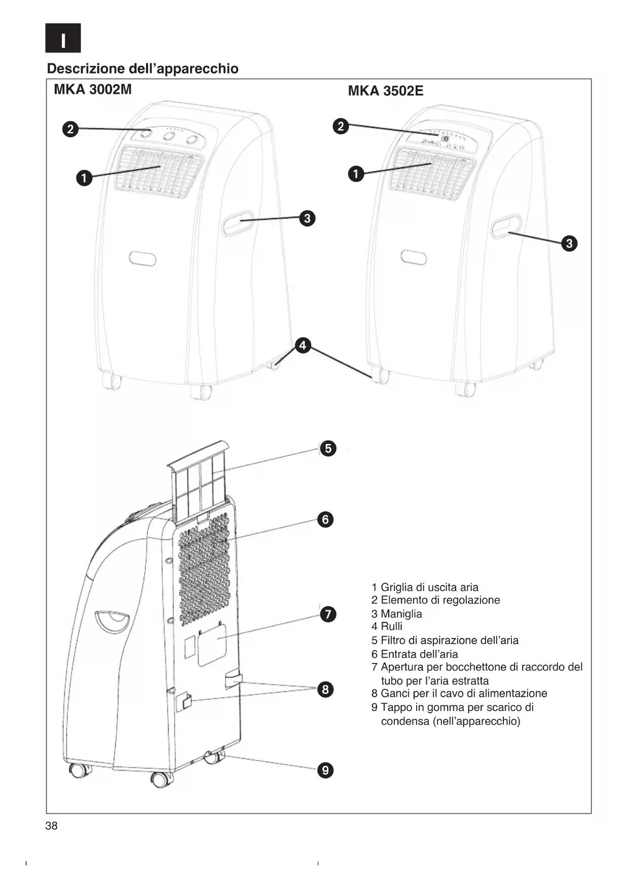I Anleitung MKA 3002 M SPK1:Anleitung MKA 3501 E SPK 1 26.10.2006 7:45 Uhr Seite 3940 Spegnete subito l’apparecchio e staccate la spinadalla presa di corrente non appena constatateuno stato d’esercizio anomalo (ad es. odore dibruciato). Se continuate ad usare l’apparecchione possono risultare per es. guastiall’apparecchio, scosse elettriche e danniprovocati da incendio. Non staccate la spina dalla presa di tirando ilcavo. Tenete bene la spina per staccarla dallapresa di corrente. Altrimenti si può danneggiare ilcavo. Non toccate mai un interruttore con le manibagnate. Altrimenti sussiste il pericolo di unascossa elettrica. Non dirigete il getto d’aria fredda direttamente sudi voi e non lasciate diventare troppo fredda l’arianel locale. Ne possono derivare malessere eproblemi di salute. Non mettete piante o animali direttamente nelflusso dell’aria fredda. Animali e piante possonosoffrire per il flusso dell’aria fredda. Non inserite mai dita o oggetti nelle aperture diuscita dell’aria. Il ventilatore rotante può causarelesioni. Non riparate o eseguite voi la manutenzione delclimatizzatore. I lavori di riparazione omanutenzione non eseguiti a regola d’artepossono danneggiare l’apparecchio e possonocausare incendi o danni per acqua di condensa. Prima della pulizia dell’apparecchio spegnetelo estaccate la spina. Altrimenti sussiste il pericolo dilesioni. Non pulite il climatizzatore con l’acqua. Nepotrebbero conseguire una scossa elettrica oincendi. Non usate detergenti infiammabili. Possonocausare incendi e deformazioni al rivestimento. Non toccate parti metalliche dell’unità internaquando togliete il filtro dell’aria. Vi potreste ferire. Se il climatizzatore viene usato per un periodoprolungato il locale deve essere di tanto in tantoaerato. Altrimenti si può verificare una mancanzadi ossigeno. Non installate l’apparecchio in un ambiente dovepossono verificarsi emissioni di gas infiammabili.Le emissioni di gas accumulatesi possonoprovocare un’esplosione. Non tenete oggetti accesi nelle vicinanzedell’apparecchio verso i quali potrebbe dirigersidirettamente il getto di aria in uscita. Ne potrebbederivare una combustione incompleta. Staccate la spina dalla presa di corrente se nonusate a lungo l’apparecchio. In caso di temporale spegnete l’apparecchio estaccate la spina dalla presa di corrente.Altrimenti potrebbero venire danneggiate le partielettriche a causa di sovratensione. In caso di perdite nel circuito del liquidorefrigerante spegnete subito l’apparecchio erivolgetevi al vostro partner del servizioassistenza. Se il liquido refrigerante fuoriesce in un locale, ilcontatto con una fiamma può generare di gas Per evitare disturbi elettromagnetici tenetel’apparecchio lontano da apparecchi radio etelevisivi. ImballaggioL’apparecchio si trova in una confezione per evitare idanni dovuti al trasporto. Conservate l’imballaggioper tenere poi l’apparecchio (per es. durantel’inverno). Se doveste tuttavia gettare l’imballaggio,esso rappresenta una materia prima e può perciòessere riutilizzato o riciclato. Accessori 11 Bocchettone di raccordo dello sfiato12 Anello passante13 Tubo dellʼaria estratta14 Gommapiuma (si usa in caso di fuoriuscita dellʼaria di scarico dalla finestra aperta)15 Gommapiuma (si usa in caso di fuoriuscita dellʼaria di scarico dalla finestra aperta nellʼarea ancora aperta della finestra). Se è possibile evitare che ulteriore aria calda entri nellʼambiente da fuori.16 Copertura per passaggio attraverso finestra - parete17 Serbatoio di raccolta della condensa18 tubo di scarico dellʼacqua I