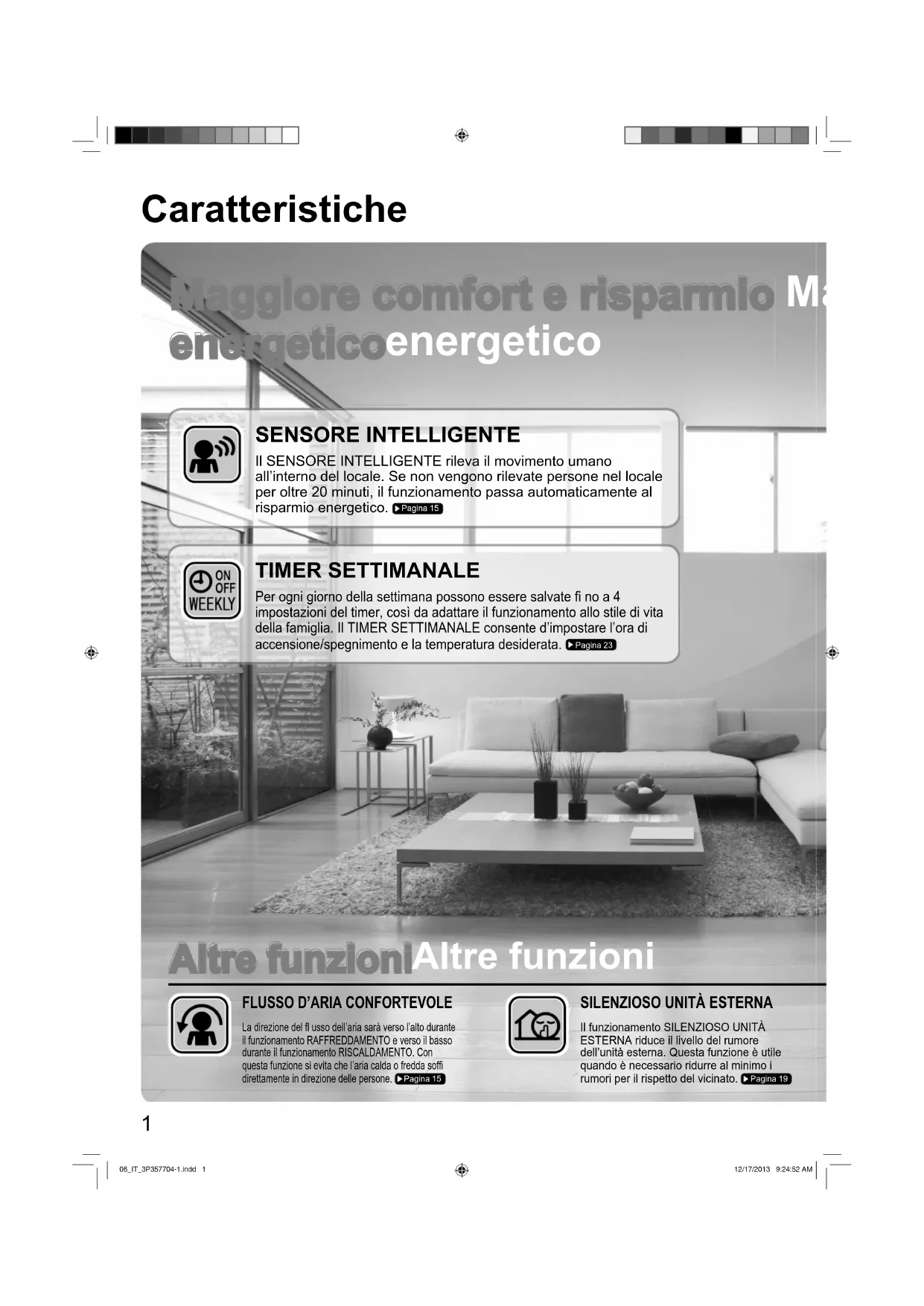 FLUSSO D’ARIA CONFORTEVOLE SILENZIOSO UNITÀ ESTERNA La direzione del fl usso dell’aria sarà verso l’alto durante il funzionamento RAFFREDDAMENTO e verso il basso durante il funzionamento RISCALDAMENTO. Con questa funzione si evita che l’aria calda o fredda soffi direttamente in direzione delle persone. Pagina 15Il funzionamento SILENZIOSO UNITÀ ESTERNA riduce il livello del rumore dell’unità esterna. Questa funzione è utile quando è necessario ridurre al minimo i rumori per il rispetto del vicinato.