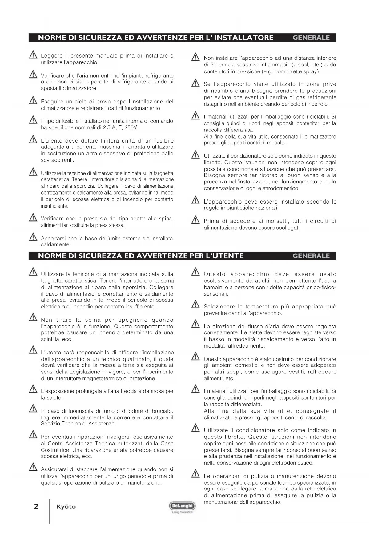 Utilizzate il condizionatore solo come indicate in quello libretto. Queste istruzioni non intendono coprire agli possibile condizione e situazione che può presentarsi. Bisognà sempre far ricorso al buon senso e alla prudenza nell'installazione, nel funzionamento e nella conservazione di agli elettrodomestico.