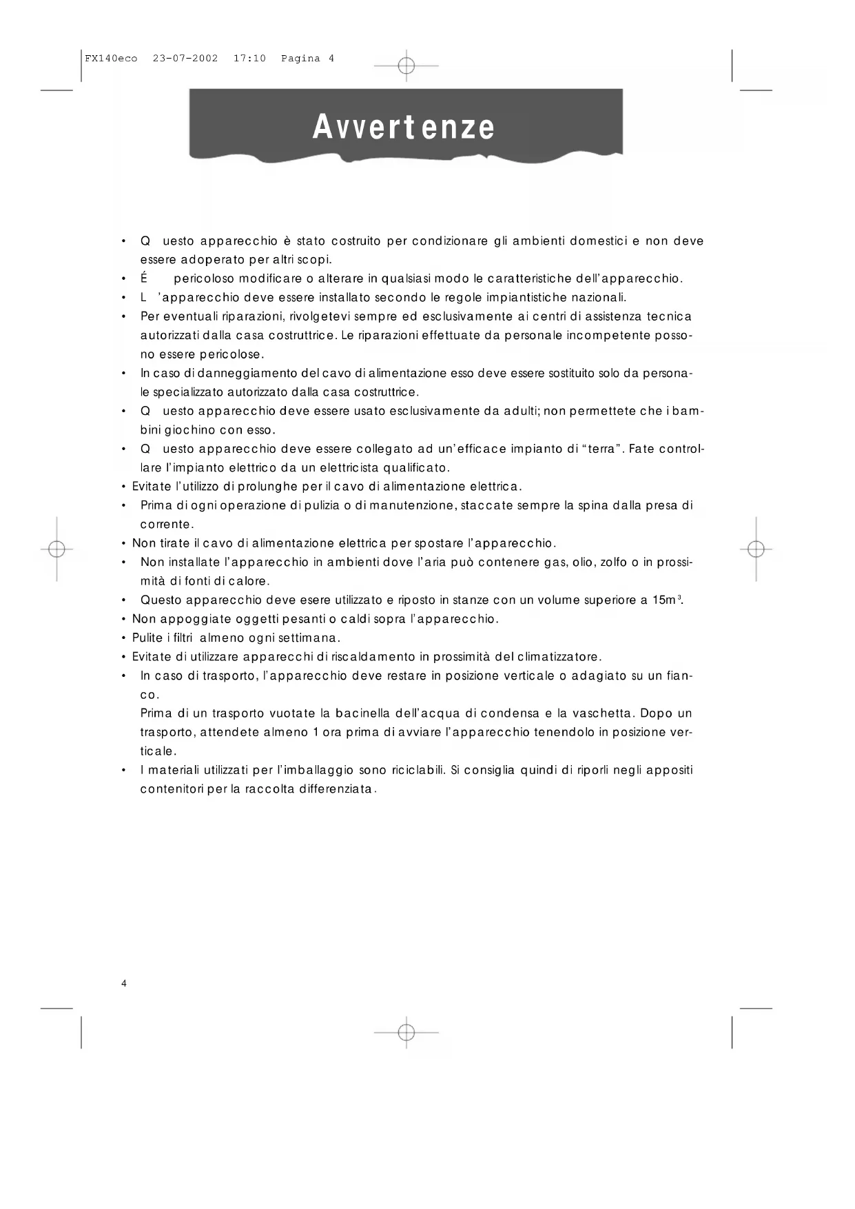 - Q uesto apparecchio è stato costruito per condizionare gli ambienti domestici e non deve essere adoperato per altri scopi.