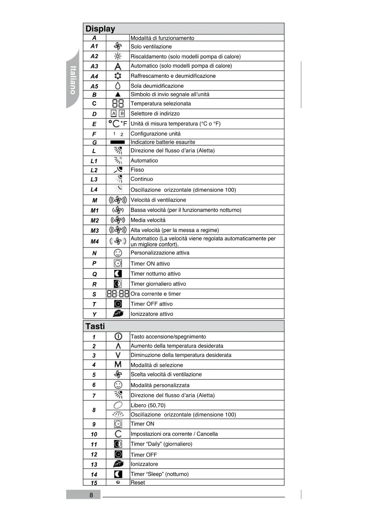 Tasto accensione/spegnimento Aumento della temperatura desiderata Diminuzione della temperatura desiderata Modalità di selezione Scelta velocità di ventilazione Modalità personalizzata Direzione del flusso d’aria (Aletta) Libero (50,70)Oscillazione orizzontale (dimensione 100) Timer ON Impostazioni ora corrente / Cancella Timer “Daily” (giornaliero) Timer OFF Ionizzatore Timer “Sleep” (notturno) Reset Italiano9