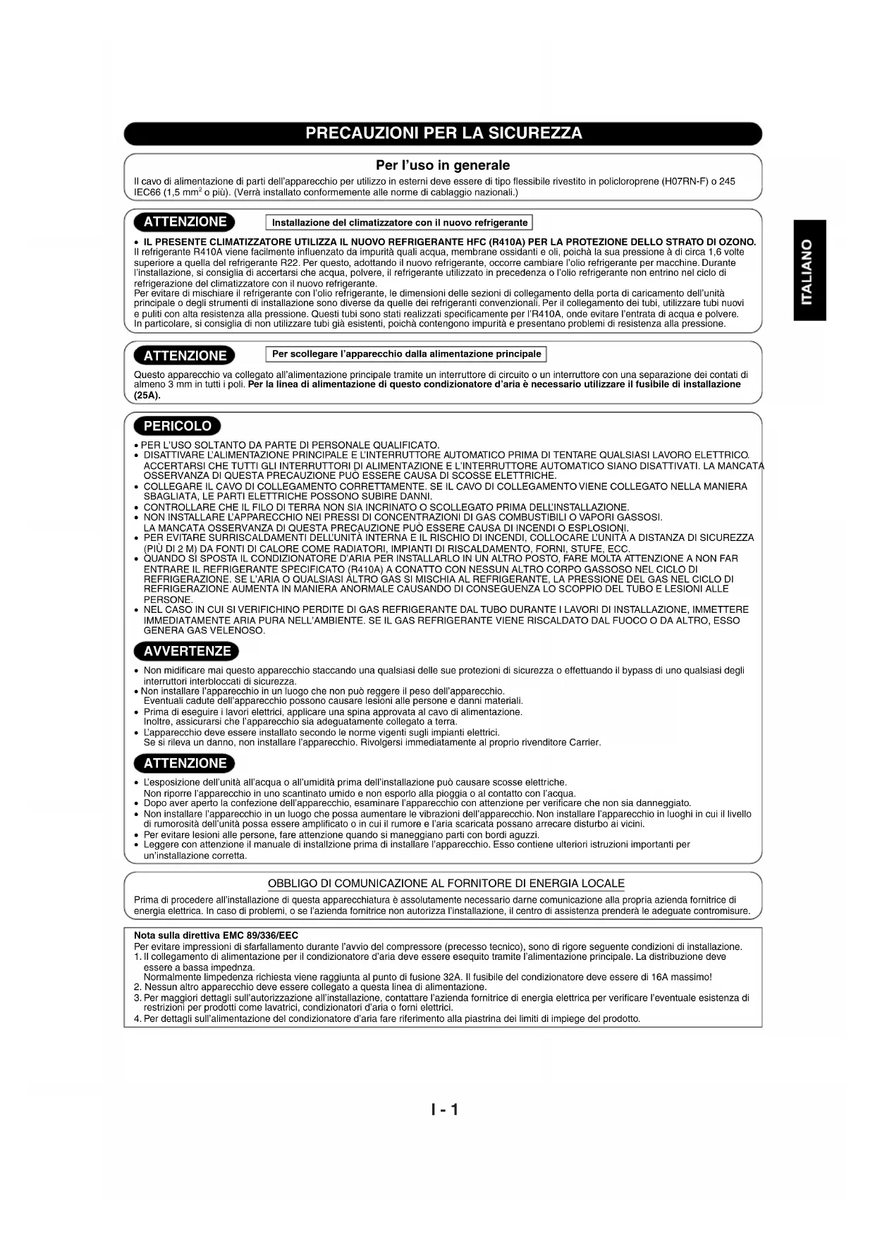 - IL PRESENTE CLIMATIZZATORE UTILIZZA IL NUOVO REFRIGERANTE HFC (R410A) PER LA PROTEZIONE DELLO STRATO DI OZONO. Il refrigerante R410A viene facilmente influenzato da impurità quali acqua, membrane ossidanti e oli, poichà la sua pressione à di circa 1,6 volte superiore a quella del refrigerante R22. Per questo, adottando il nuovo refrigerante, occorre cambiare l’olio refrigerante per macchine. Durante l’installazione, si consiglia di accertarsi che acqua, polvere, il refrigerante utilizzato in precedenza o l’olio refrigerante non entrino nel ciclo di refrigerazione del climatizzatore con il nuovo refrigerante. Per evitare di mischiare il refrigerante con l’olio refrigerante, le dimensioni delle sezioni di collegamento della porta di caricamento dell’unità principale o degli strumenti di installazione sono diverse da quelle dei refrigeranti convenzionali. Per il collegamento dei tubi, utilizzare tubi nuovi e puliti con alta resistenza alla pressione. Questi tubi sono stati realizzati specificamente per l’R410A, onde evitare l’entrata di acqua e polvere. In particolare, si consiglia di non utilizzare tubi già esistenti, poichà contengono impurità e presentano problemi di resistenza alla pressione. Installazione del climatizzatore con il nuovo refrigerante OBBLIGO DI COMUNICAZIONE AL FORNITORE DI ENERGIA LOCALE Prima di procedere all’installazione di questa apparecchiatura è assolutamente necessario darne comunicazione alla propria azienda fornitrice di energia elettrica. In caso di problemi, o se l’azienda fornitrice non autorizza l’installazione, il centro di assistenza prenderà le adeguate contromisure. Nota sulla direttiva EMC 89/336/EEC Per evitare impressioni di sfarfallamento durante l’avvio del compressore (precesso tecnico), sono di rigore seguente condizioni di installazione. 1. Il collegamento di alimentazione per il condizionatore d’aria deve essere esequito tramite l’alimentazione principale. La distribuzione deve essere a bassa impednza. Normalmente limpedenza richiesta viene raggiunta al punto di fusione 32A. Il fusibile del condizionatore deve essere di 16A massimo!