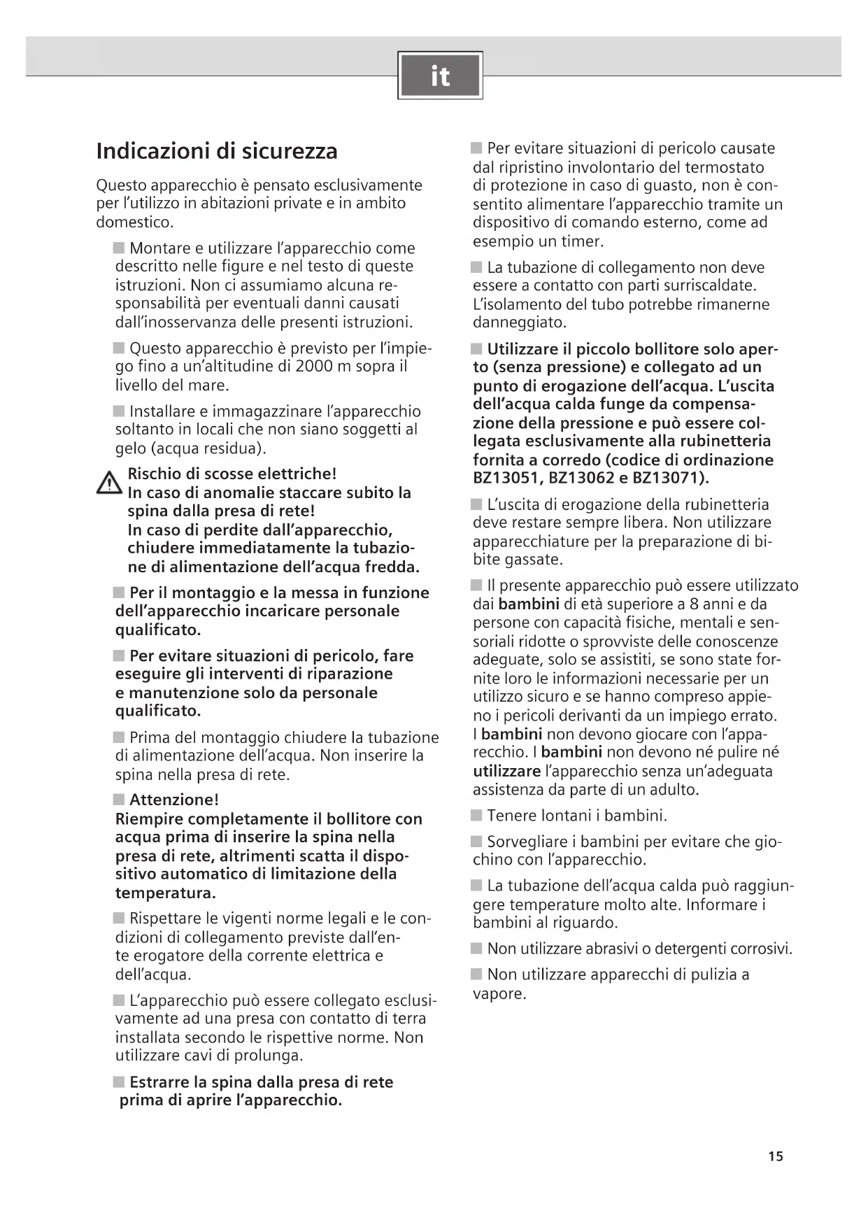 ■ Prima di utilizzare l’apparecchio, leggere attentamente queste istruzioni per l’uso! ■ Importante: non esporre mai l’apparecchio al gelo! Rischio di scosse elettriche!In caso di anomalie staccare subito la spina dalla presa di rete!In caso di perdite dall’apparecchio, chiudere imme-diatamente la tubazione di alimentazione dell’acqua fredda.Leggere attentamente e osservare le istruzioni di sicurezza dettagliate all’inizio di questo manuale d’istruzioni!