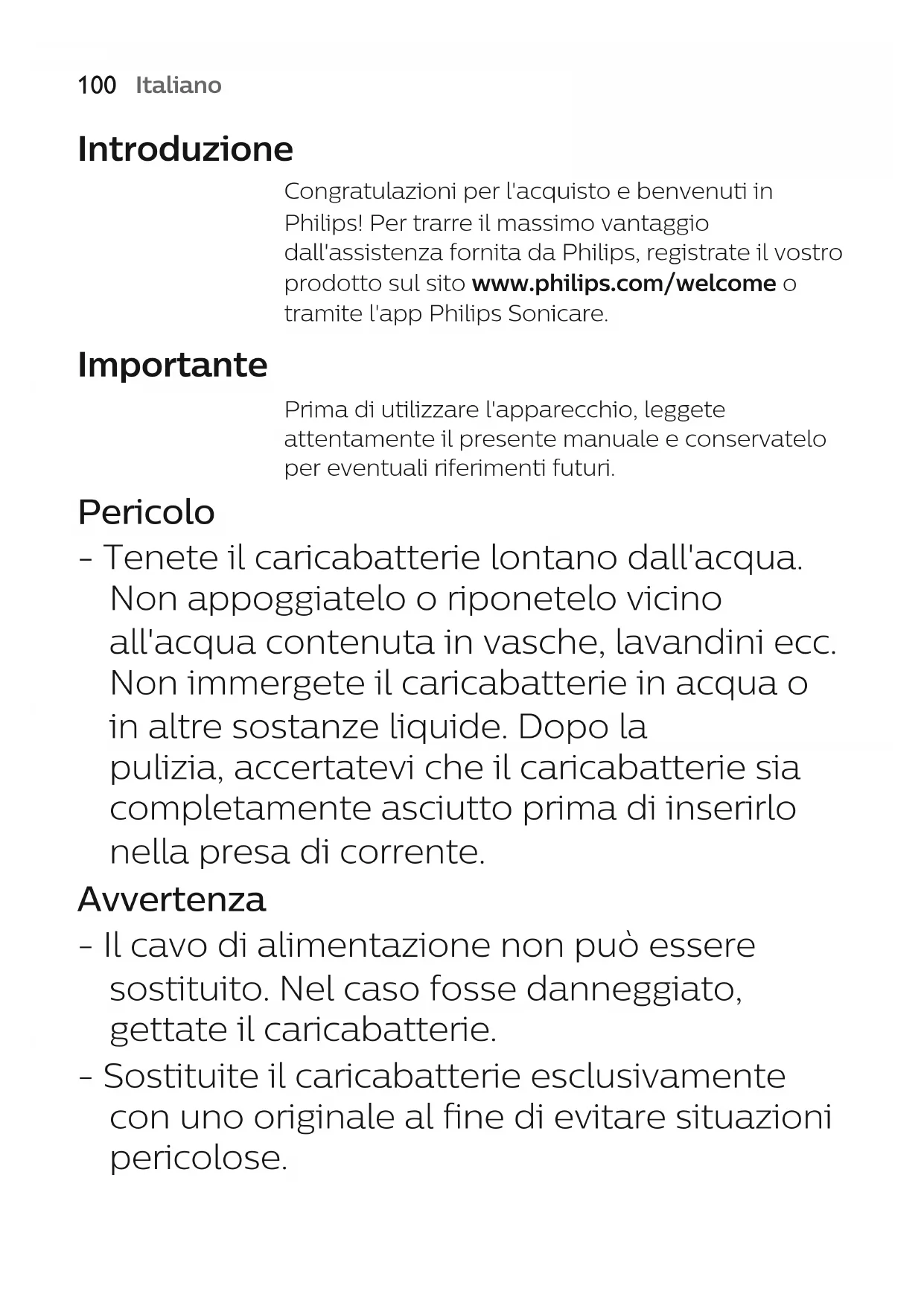 FrançaisItaliano Introduzione Congratulazioni per l'acquisto e benvenuti in Philips! Per trarre il massimo vantaggio dall'assistenza fornita da Philips, registrate il vostro prodotto sul sito www.philips.com/welcome o tramite l'app Philips Sonicare. Importante Prima di utilizzare l'apparecchio, leggete attentamente il presente manuale e conservatelo per eventuali riferimenti futuri. Pericolo - Tenete il caricabatterie lontano dall'acqua. Non appoggiatelo o riponetelo vicino all'acqua contenuta in vasche, lavandini ecc. Non immergete il caricabatterie in acqua o in altre sostanze liquide. Dopo la pulizia,accertatevi che il caricabatterie sia completamente asciutto prima di inserirlo nella presa di corrente. Avvertenza - Il cavo di alimentazione non può essere sostituito. Nel caso fosse danneggiato, gettate il caricabatterie. - Sostituite il caricabatterie esclusivamente con uno originale al fine di evitare situazioni pericolose.
