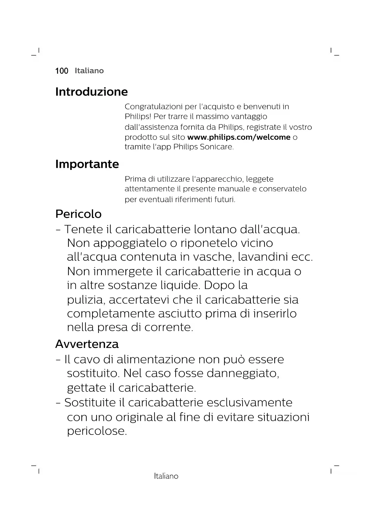 FrançaisItaliano Introduzione Congratulazioni per l'acquisto e benvenuti in Philips! Per trarre il massimo vantaggio dall'assistenza fornita da Philips, registrate il vostro prodotto sul sito www.philips.com/welcome o tramite l'app Philips Sonicare. Importante Prima di utilizzare l'apparecchio, leggete attentamente il presente manuale e conservatelo per eventuali riferimenti futuri. Pericolo - Tenete il caricabatterie lontano dall'acqua. Non appoggiatelo o riponetelo vicino all'acqua contenuta in vasche, lavandini ecc. Non immergete il caricabatterie in acqua o in altre sostanze liquide. Dopo la pulizia, accertatevi che il caricabatterie sia completamente asciutto prima di inserirlo nella presa di corrente. Avvertenza - Il cavo di alimentazione non può essere sostituito. Nel caso fosse danneggiato, gettate il caricabatterie. - Sostituite il caricabatterie esclusivamente con uno originale al fine di evitare situazioni pericolose.