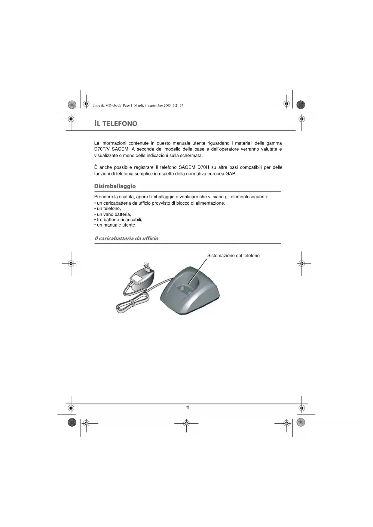 MEMO Livre du MD+.book Page II Mardi, 9. septembre 2003 5:21 171 IL TELEFONO Le informazioni contenute in questo manuale utente riguardano i materiali della gammaD70T/V SAGEM. A seconda del modello della base e dell'operatore verranno valutate evisualizzate o meno delle indicazioni sulla schermata.È anche possibile registrare Il telefono SAGEM D70H su altre basi compatibili per dellefunzioni di telefonia semplice in rispetto della normativa europea GAP. Disimballaggio Prendere la scatola, aprire l’imballaggio e verificare che vi siano gli elementi seguenti:• un caricabatteria da ufficio provvisto di blocco di alimentazione, • un telefono, • un vano batteria,• tre batterie ricaricabili,• un manuale utente. Il caricabatteria da ufficio Sistemazione del telefonoLivre du MD+.book Page 1 Mardi, 9. septembre 2003 5:21 172 IL TELEFONO Il telefono Di concezione ergonomica, ne saranno apprezzati la forma e le qualità durante le conversazioni. Il navigatore elemento di selezione rapida Display Tasti programmabili Tasto accesso rubrica Riaggancio Tastiera alfanumerica Indicatore per non vedenti Accettazione Vivavoce Richiama (pressione prolungata