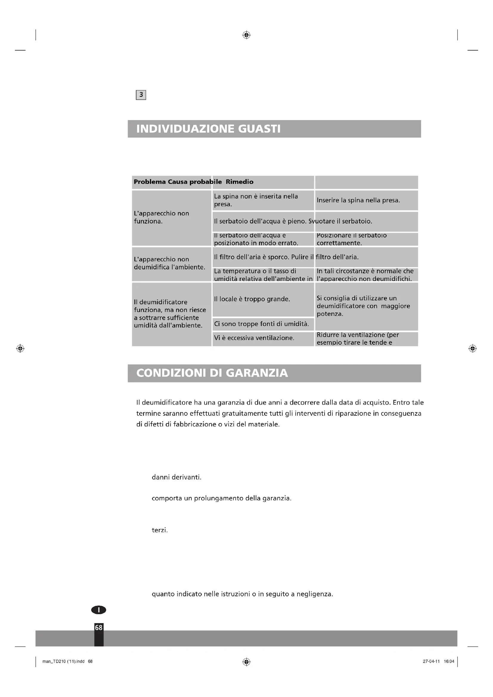 Il deumidificatore ha una garanzia di due anni a decorrere dalla data di acquisto. Entro tale termine saranno effettuati gratuitamente tutti gli interventi di riparazione in conseguenza di difetti di fabbricazione o vizi del materiale. .ELLAFATTISPECIESIAPPLICANOLESEGUENTIDISPOSIZIONI s3ARANNORESPINTITUTTIGLIALTRIRECLAMIORICHIESTEDIRISARCIMENTOCOMPRESIQUELLIPER danni derivanti. s,ARIPARAZIONEOLASOSTITUZIONEDICOMPONENTIENTROILPERIODODIGARANZIANON comporta un prolungamento della garanzia. s,AGARANZIAÒNULLANELCASOINCUISIANOSTATEAPPORTATEMODIFICHEALDEUMIDIFICATORE SIANOSTATEMONTATECOMPONENTINONORIGINALIOLAPPARECCHIOSIASTATORIPARATODA terzi. s,ECOMPONENTISOGGETTEANORMALEUSURANONSONOCOMPRESENELLAGARANZIA s0ERESIGERELAPPLICAZIONEDELLAGARANZIASIDOVRËPRESENTARELOSCONTRINODACQUISTO ORIGINALEDATATOENONDOVRANNOESSERSTATEAPPORTATEMODIFICHEDALCUNTIPO ALLAPPARECCHIO s,AGARANZIAÒNULLAINCASODIDANNISORTIINSEGUITOADAZIONICHEDIFFERISCONODA quanto indicato nelle istruzioni o in seguito a negligenza.