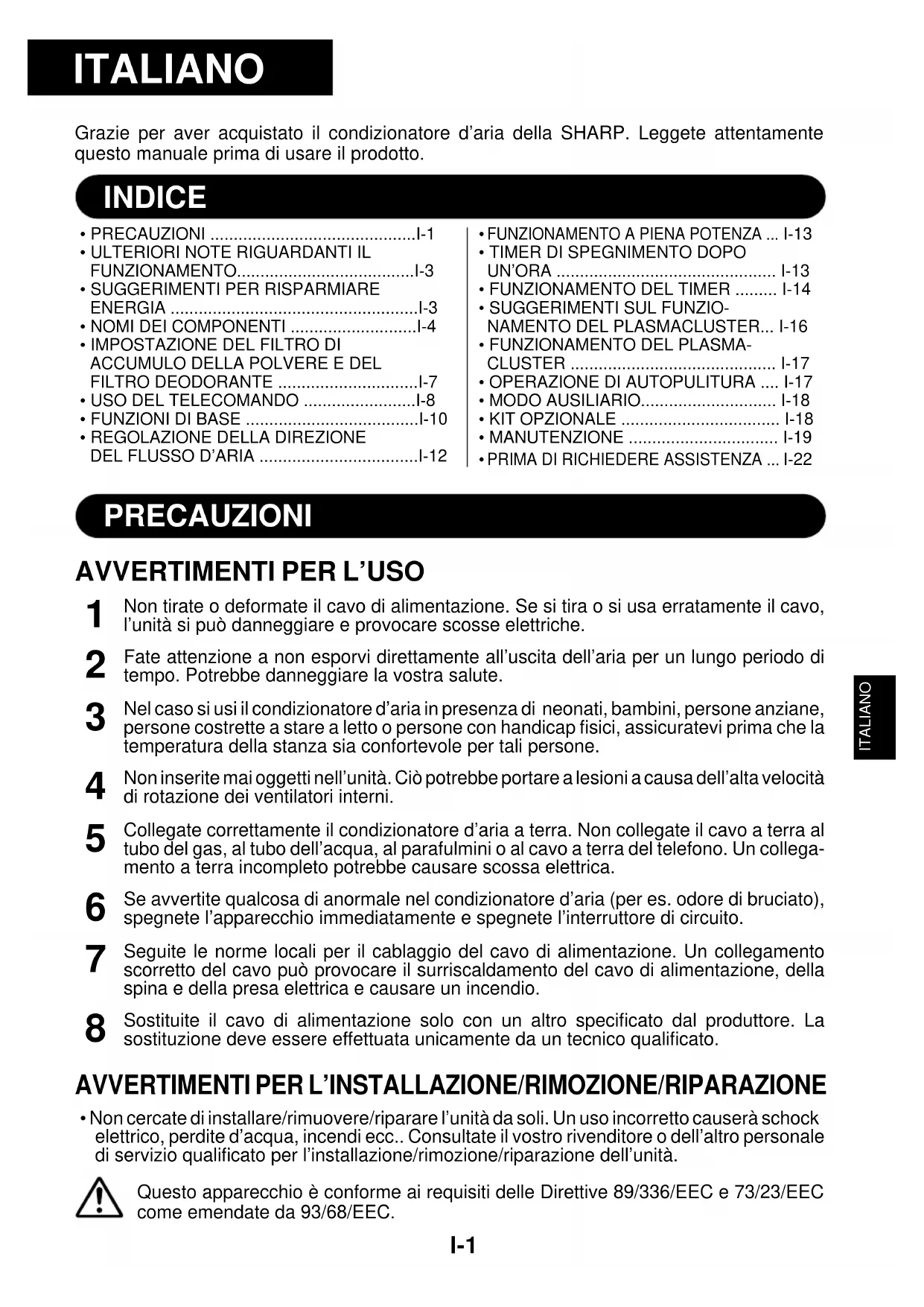- Non cercate di installare/rimuovere/riparare l’unità da soli. Un uso incorretto causerà schockelettrico, perdite d’acqua, incendi ecc.. Consultate il vostro rivenditore o dell’altro personaledi servizio qualificato per l’installazione/rimozione/riparazione dell’unità.Questo apparecchio è conforme ai requisiti delle Direttive 89/336/EEC e 73/23/EECcome emendate da 93/68/EEC. ITALIANOPRECAUZIONI