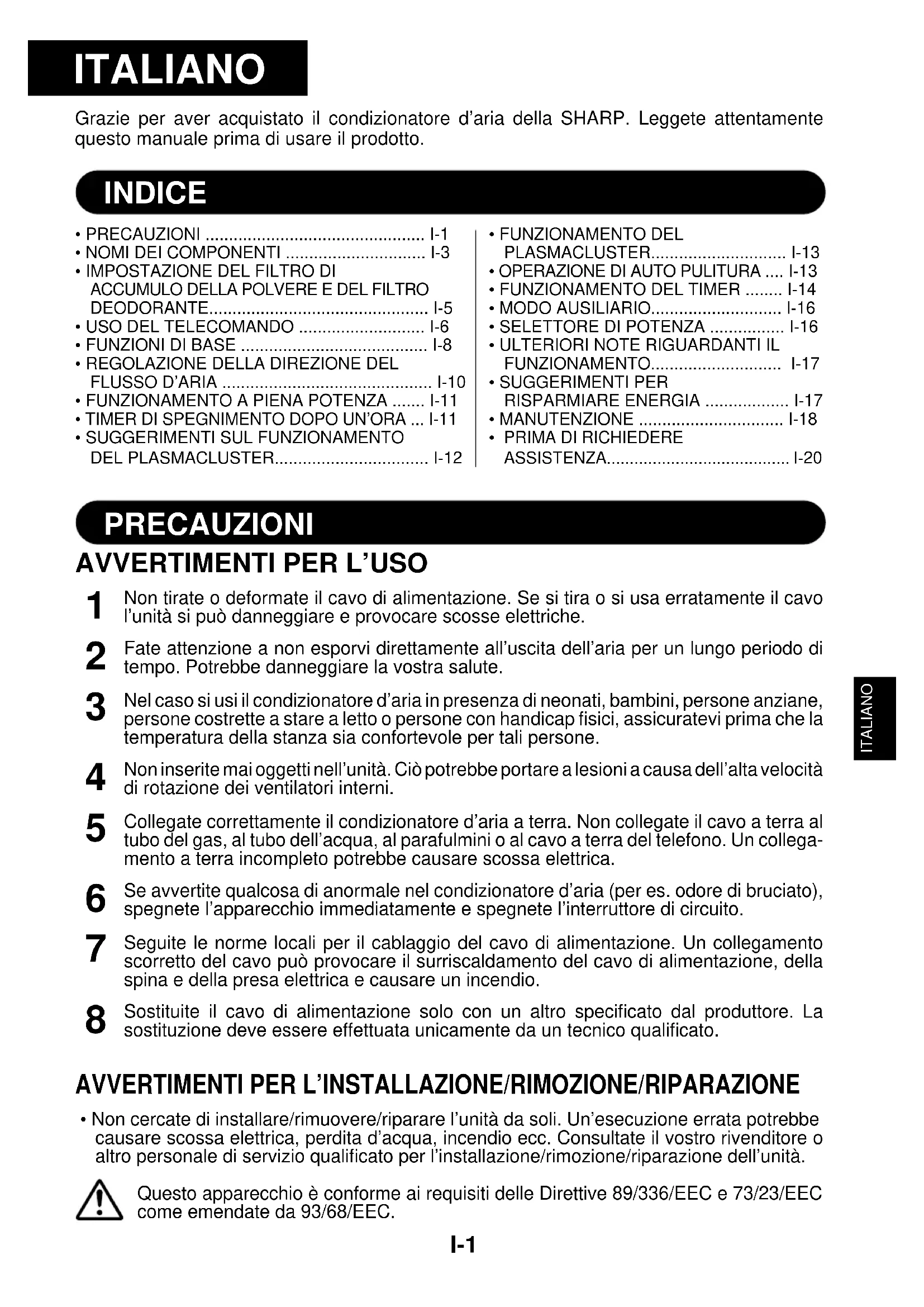 - Non cercate di installare/rimuovere/riparare l’unità da soli. Un’esecuzione errata potrebbecausare scossa elettrica, perdita d’acqua, incendio ecc. Consultate il vostro rivenditore oaltro personale di servizio qualificato per l’installazione/rimozione/riparazione dell’unità.Questo apparecchio è conforme ai requisiti delle Direttive 89/336/EEC e 73/23/EECcome emendate da 93/68/EEC. PRECAUZIONIPRECAUZIONI