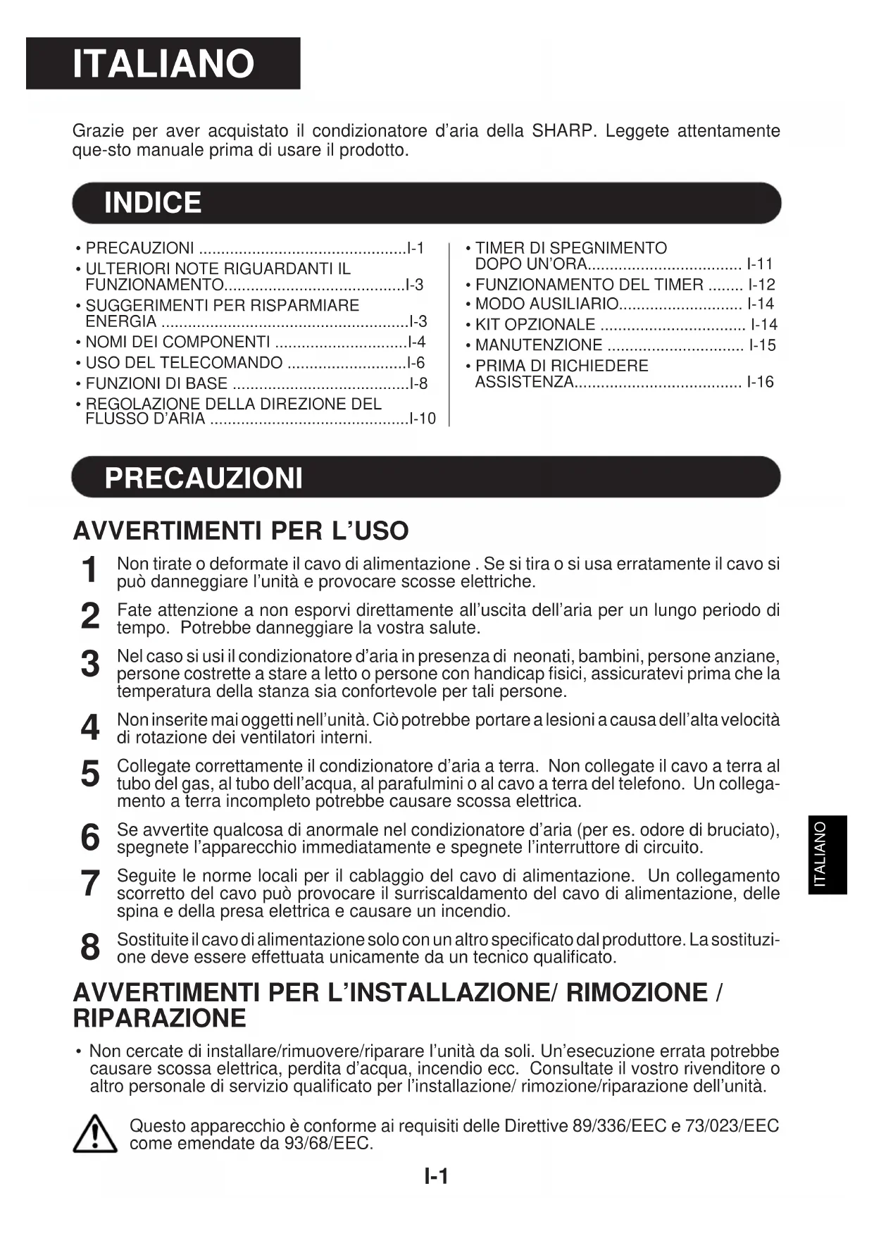 - Non cercate di installare/rimuovere/riparare l’unità da soli. Un’esecuzione errata potrebbe causare scossa elettrica, perdita d’acqua, incendio ecc. Consultate il vostro rivenditore oaltro personale di servizio qualificato per l’installazione/ rimozione/riparazione dell’unità.Questo apparecchio è conforme ai requisiti delle Direttive 89/336/EEC e 73/023/EECcome emendate da 93/68/EEC. ITALIANOPRECAUZIONI