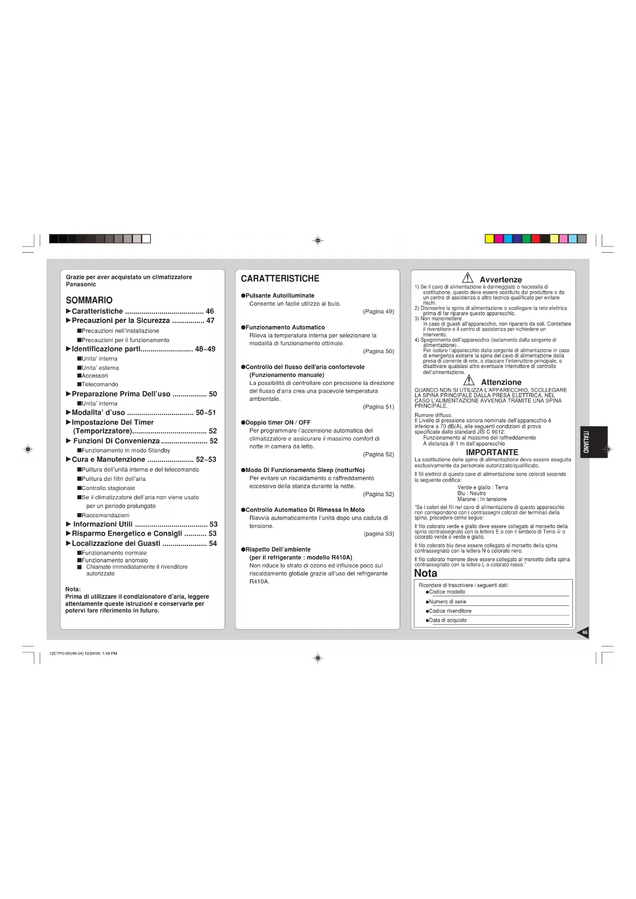 - ITALIANOGrazie per aver acquistato un climatizzatorePanasonic SOMMARIO : Caratteristiche p. 46