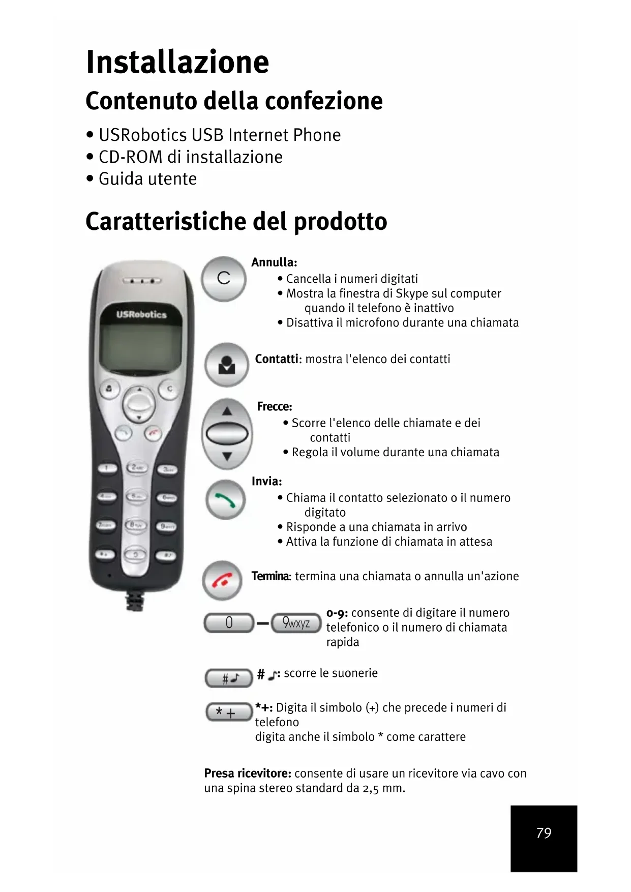Frecce: • Scorre l'elenco delle chiamate e dei contatti• Regola il volume durante una chiamata #80 Requisiti del sistema Per usare USRobotics USB Internet Phone e il servizio di telefonia Skype™ su Internet, il computer deve possedere i seguenti requisiti:
