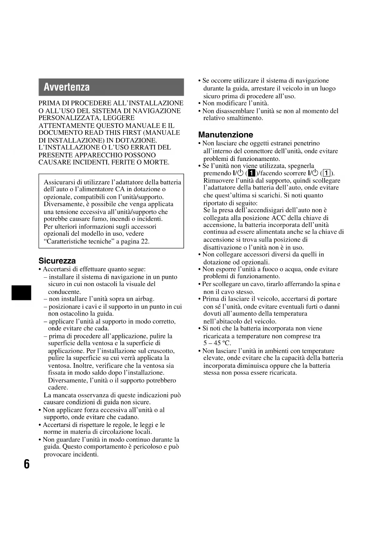 - Non lasciare l’unità in ambienti con temperature elevate, onde evitare che la capacità della batteria incorporata diminuisca oppure che la batteria stessa non possa essere ricaricata. Assicurarsi di utilizzare l’adattatore della batteria dell’auto o l’alimentatore CA in dotazione o opzionale, compatibili con l’unità/supporto. Diversamente, è possibile che venga applicata una tensione eccessiva all’unità/supporto che potrebbe causare fumo, incendi o incidenti. Per ulteriori informazioni sugli accessori opzionali del modello in uso, vedere “Caratteristiche tecniche” a pagina 22.7 Informazioni sui segnali GPS Poiché le informazioni GPS vengono ottenute via satellite, potrebbe risultare impossibile o difficile ottenere le informazioni quando ci si trova nei seguenti luoghi: