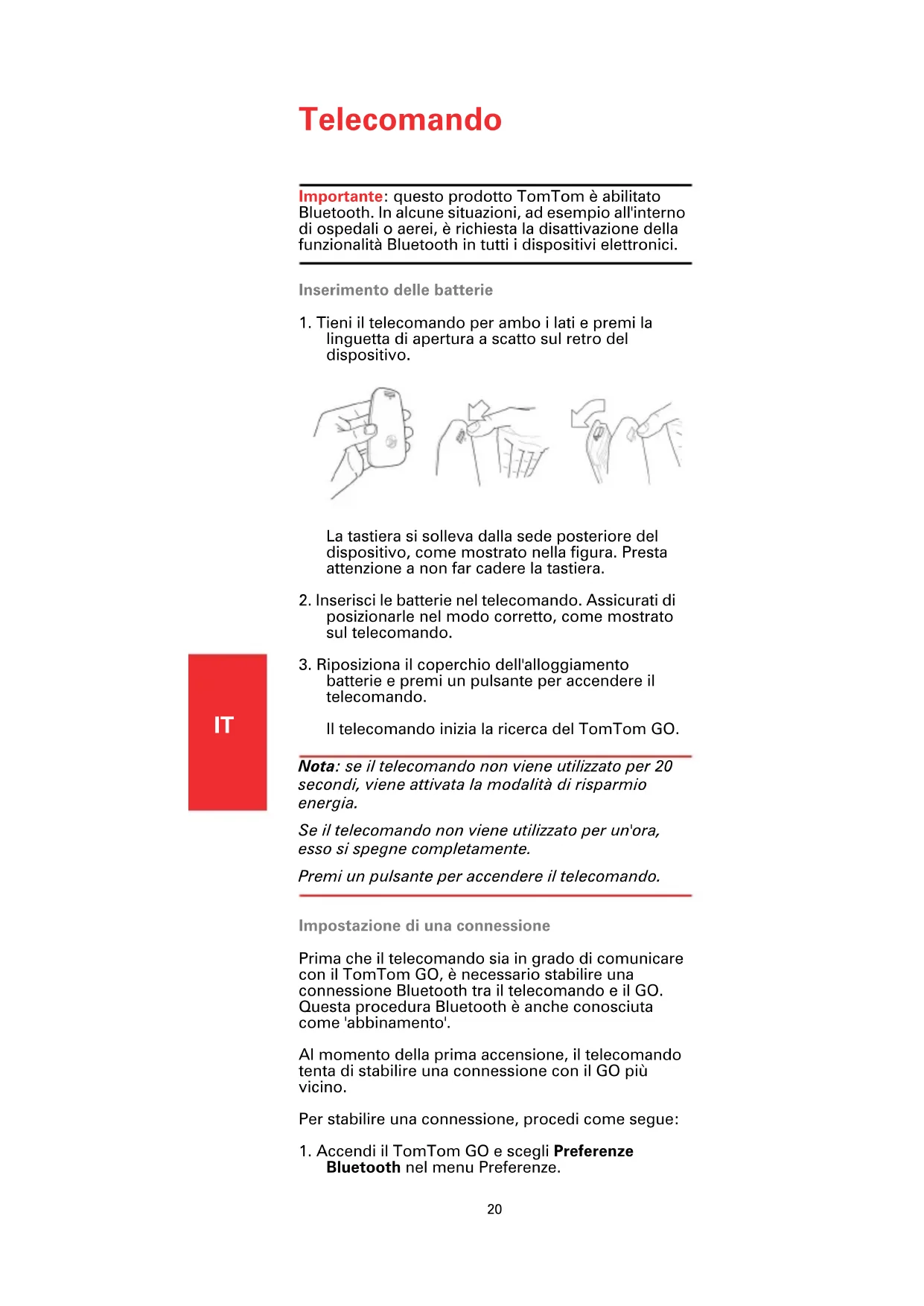 batterie e premi un pulsante per accendere il telecomando. Il telecomando inizia la ricerca del TomTom GO. Nota: se il telecomando non viene utilizzato per 20 secondi, viene attivata la modalità di risparmio energia. Se il telecomando non viene utilizzato per un'ora, esso si spegne completamente. Premi un pulsante per accendere il telecomando. Impostazione di una connessione Prima che il telecomando sia in grado di comunicare con il TomTom GO, è necessario stabilire una connessione Bluetooth tra il telecomando e il GO. Questa procedura Bluetooth è anche conosciuta come 'abbinamento'. Al momento della prima accensione, il telecomando tenta di stabilire una connessione con il GO più vicino. Per stabilire una connessione, procedi come segue: