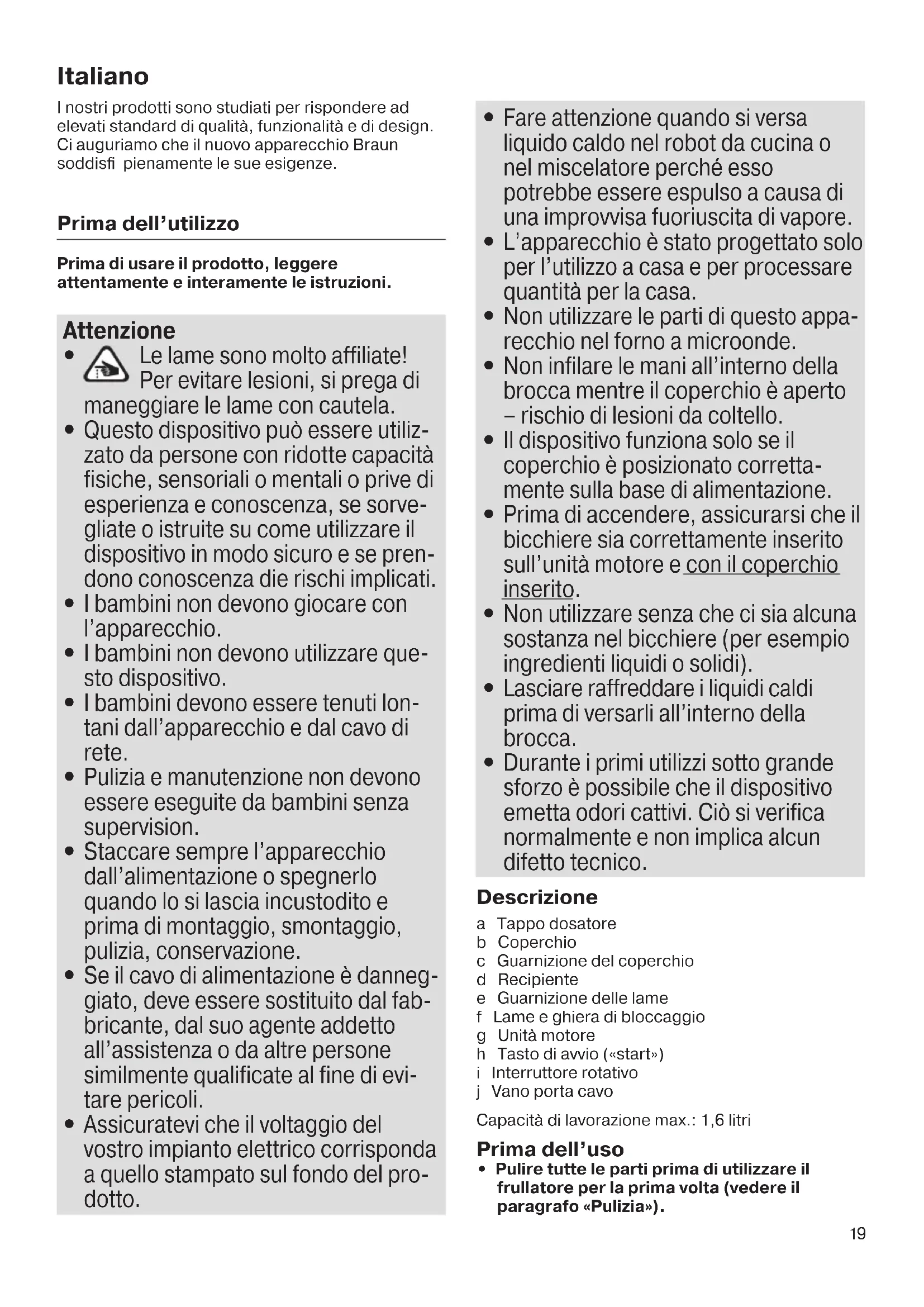 - Per la preparazione di piccole quantità di cibo, usare un livello di velocità ridotto. Pulizia Unità motore Non immergere l’unità motore nell’acqua. Pulire solo con un panno umido. Semplice pulizia / risciacquo del recipiente montato Dopo aver svuotato il recipiente, riempirlo con acqua. Posizionarlo sull’unità motore e ruotare l’interruttore su «» per alcune volte Svuotare il recipiente e risciacquarlo. Pulizia accurata del recipiente smontato Assicurarsi che il recipiente sia vuoto prima di svitare la ghiera di bloccaggio (f). Maneggiare le lame con cautela. Tutte le parti smontabili possono essere lavate in lavastoviglie. Per pulire il coperchio in modo accurato, si consiglia di rimuovere la guarnizione del coperchio (c). Le informazioni contenute possono subire dei cambiamenti. Si raccomanda di non gettare il prodotto nella spazzatura al termine della sua vita utile. Per lo smaltimento, rivolgersi ad un qualsiasi Centro Assistenza Braun o ad un centro specifi co.22 Onze produkten zij n ontwikkeld om aan de hoogste kwaliteitseisen, functionaliteit en vormgeving te voldoen. Wij hopen dat u veel plezier zult hebben van uw nieuwe Braun apparaat. Vóór gebruik Lees de handleiding voordat u het apparaat in gebruik neemt in zij n geheel zorgvuldig door. Waarschuwing