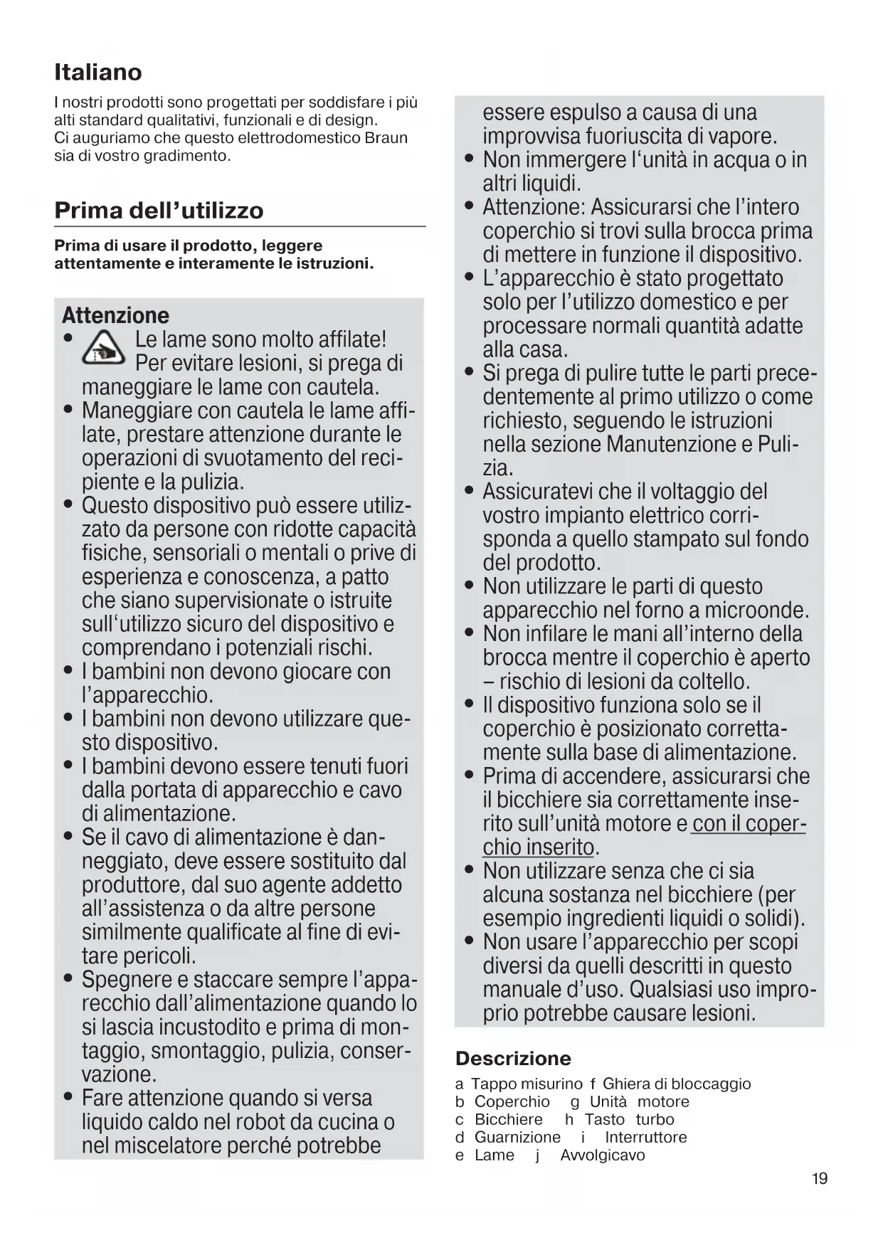 Non usare l’apparecchio per scopi diversi da quelli descritti in questo manuale d’uso. Qualsiasi uso impro- prio potrebbe causare lesioni. Descrizione a Tappo misurino f Ghiera di bloccaggio b Coperchio g Unità motore c Bicchiere h Tasto turbo d Guarnizione i Interruttore e Lame j Avvolgicavo 5722310344_JB3010_JB3060_JB3070_INT_S4-78.indd 19 05.07.17 15:3020 Prima di utilizzare l’apparecchio