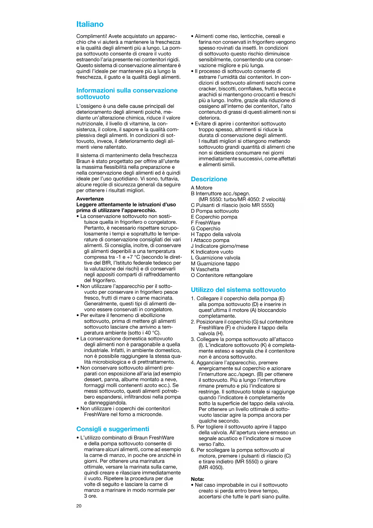 - Evitare di aprire i contenitori sottovuoto troppo spesso, altrimenti si riduce la durata di conservazione degli alimenti. I risultati migliori si ottengono mettendo sottovuoto grandi quantità di alimenti che non si desidera consumare nei giorni immediatamente successivi, come affettati e alimenti simili. Descrizione A Motore B Interruttore acc./spegn. (MR 5550: turbo/MR 4050: 2 velocità) C Pulsanti di rilascio (solo MR 5550) D Pompa sottovuoto E Coperchio pompa F FreshWare G Coperchio H Tappo della valvola I Attacco pompa J Indicatore giorno/mese K Indicatore vuoto L Guarnizione valvola M Guarnizione tappo N Vaschetta O Contenitore rettangolare Utilizzo del sistema sottovuoto