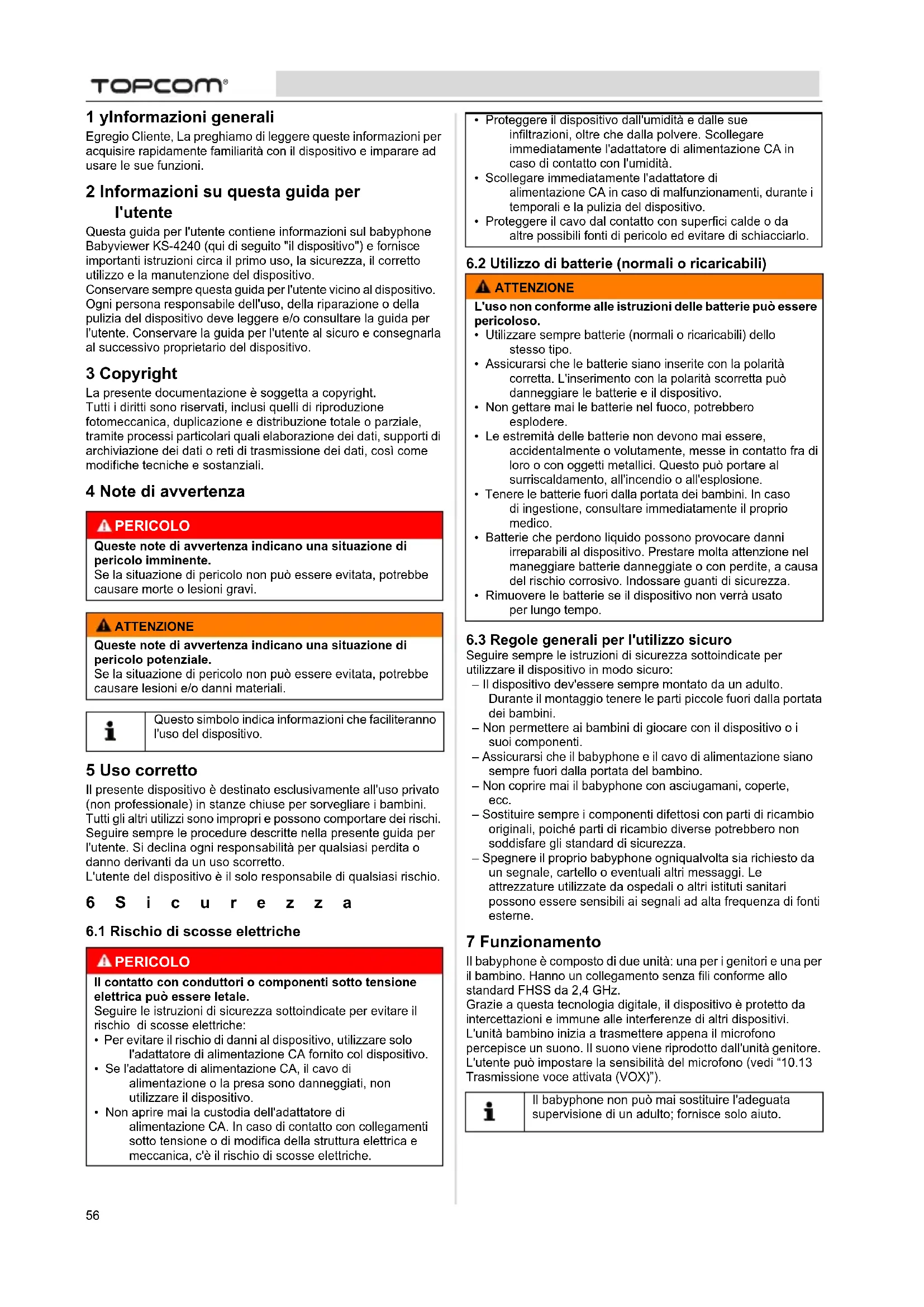 1 yInformazioni generali Egregio Cliente, La preghiamo di leggere queste informazioni per acquisire rapidamente familiarità con il dispositivo e imparare ad usare le sue funzioni. 2 Informazioni su questa guida per l'utente Questa guida per l'utente contiene informazioni sul babyphone Babyviewer KS-4240 (qui di seguito "il dispositivo") e fornisce importanti istruzioni circa il primo uso, la sicurezza, il corretto utilizzo e la manutenzione del dispositivo. Conservare sempre questa guida per l'utente vicino al dispositivo. Ogni persona responsabile dell'uso, della riparazione o della pulizia del dispositivo deve leggere e/o consultare la guida per l'utente. Conservare la guida per l'utente al sicuro e consegnarla al successivo proprietario del dispositivo. 3 Copyright La presente documentazione è soggetta a copyright. Tutti i diritti sono riservati, inclusi quelli di riproduzione fotomeccanica, duplicazione e distribuzione totale o parziale, tramite processi particolari quali elaborazione dei dati, supporti di archiviazione dei dati o reti di trasmissione dei dati, così come modifiche tecniche e sostanziali. 4 Note di avvertenza 5 Uso corretto Il presente dispositivo è destinato esclusivamente all'uso privato (non professionale) in stanze chiuse per sorvegliare i bambini. Tutti gli altri utilizzi sono impropri e possono comportare dei rischi. Seguire sempre le procedure descritte nella presente guida per l'utente. Si declina ogni responsabilità per qualsiasi perdita o danno derivanti da un uso scorretto. L'utente del dispositivo è il solo responsabile di qualsiasi rischio. 6Sicurezza