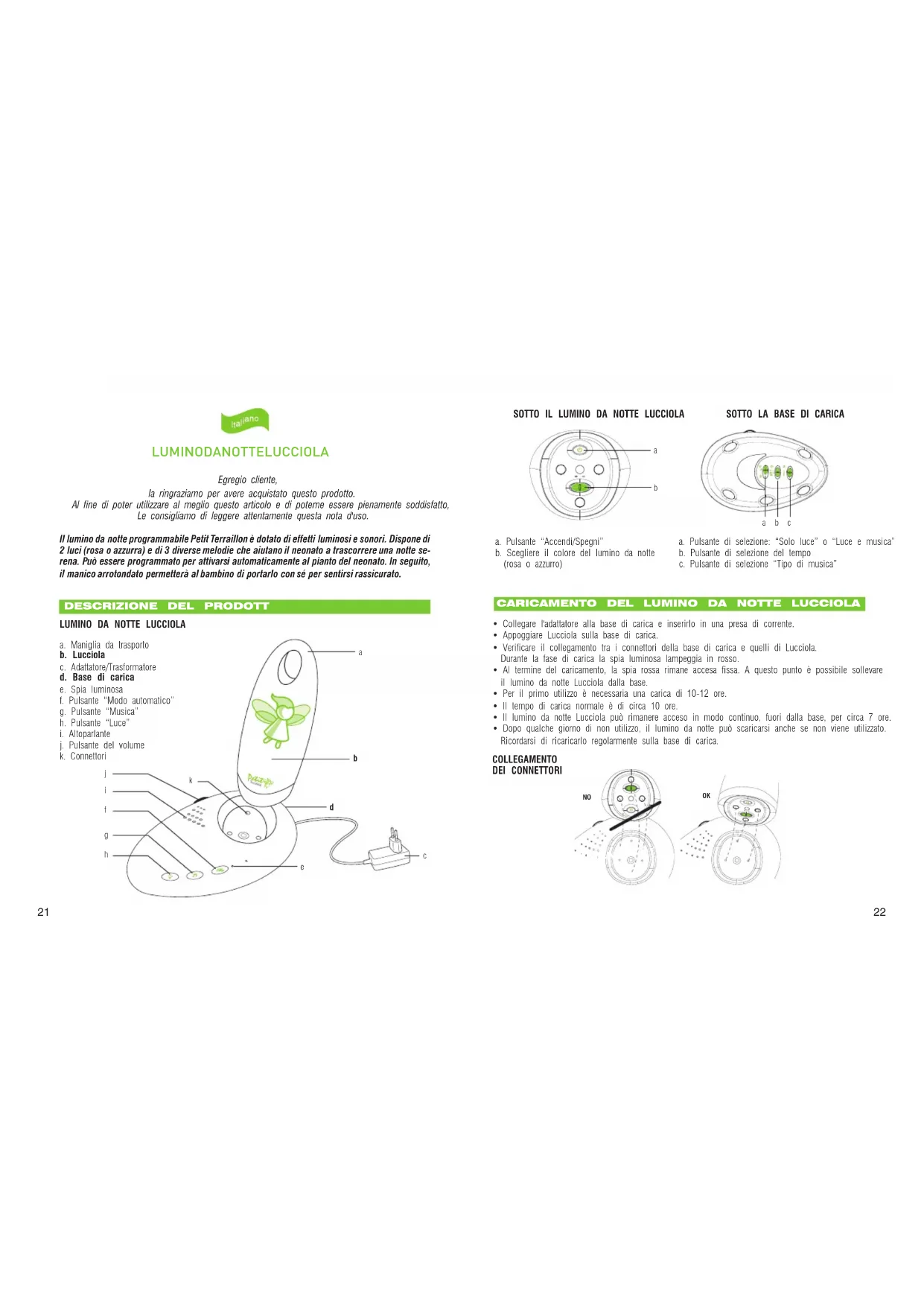 - Non toccare mai i connettori della base di carica e di Lucciola con utensili metallici, in quanto il lumino da notte potrebbe risultarne danneggiato.