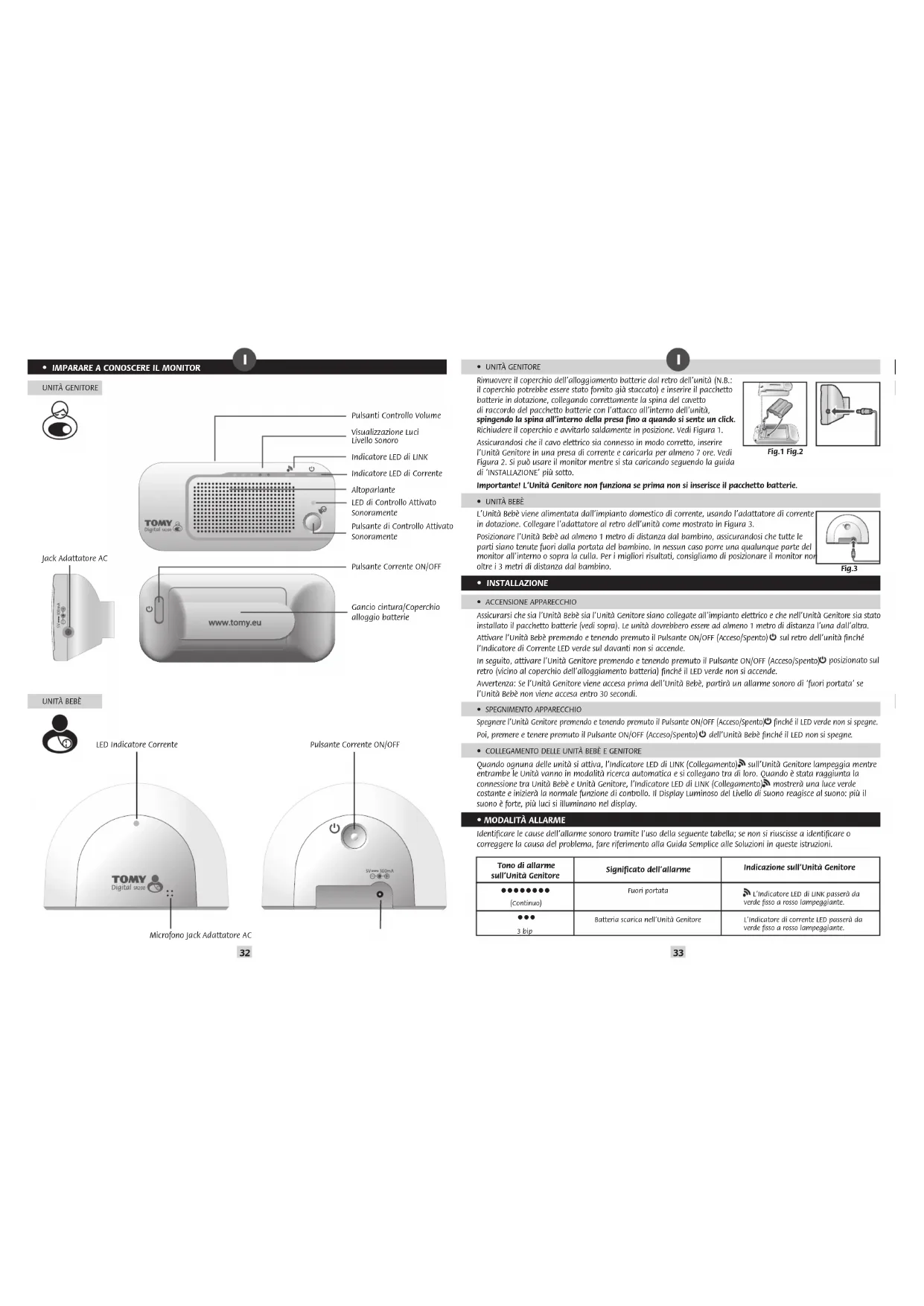 - IMPARARE A CONOSCERE IL MONITOR UNITÀ GENITORE Pulsanti Controllo Volume Visualizzazione Luci Livello Sonoro Indicatore LED di LINK Indicatore LED di Corrente Altoparlante LED di Controllo Attivato Sonoramente Pulsante di Controllo Attivato Sonoramente Pulsante Corrente ON/OFF Gancio cintura/Coperchio alloggio batterie Jack Adattatore AC UNITÀ BEBÈ Microfono Jack Adattatore AC LED Indicatore Corrente Pulsante Corrente ON/OFF Fig.1 Fig.2 Fig.3